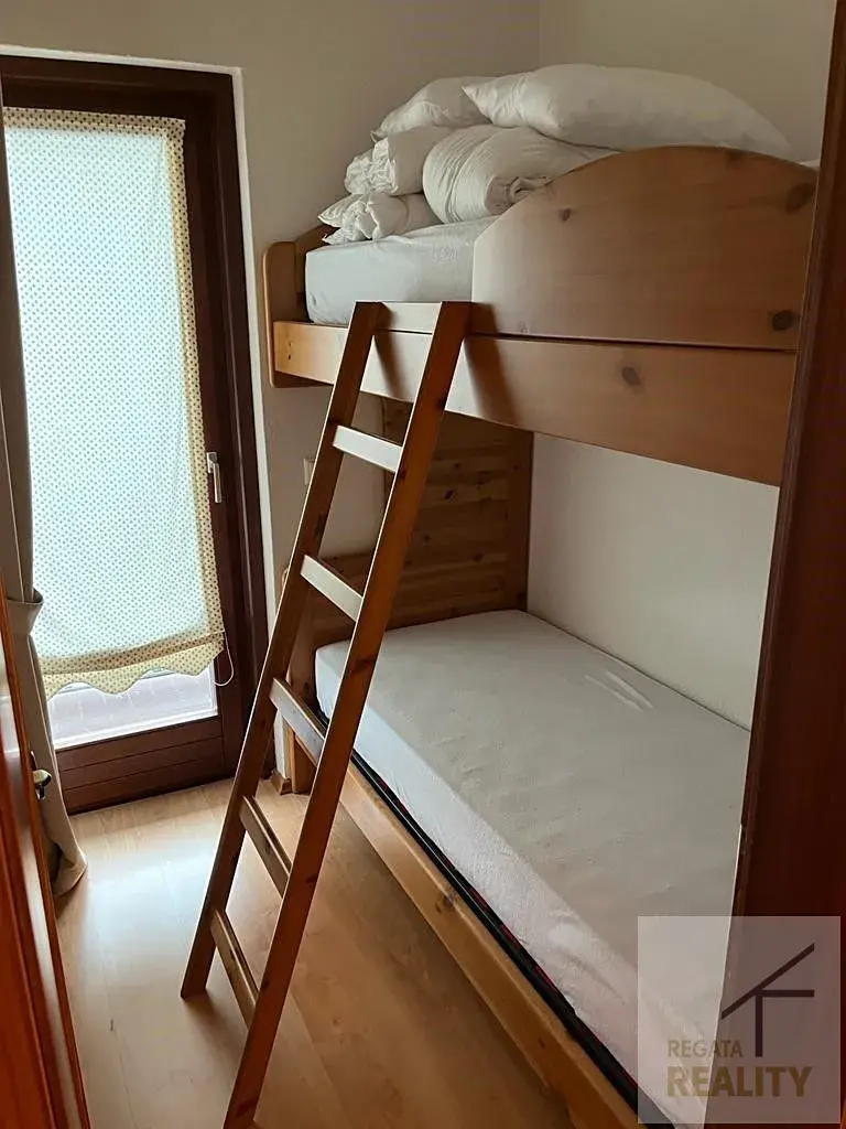 Tento apartmán má velkou ložnici se vstupem na balkon, malý dětský pokoj, koupelnu, obývací pokoj s kuchyňským koutem a také vstupem na balkon.
