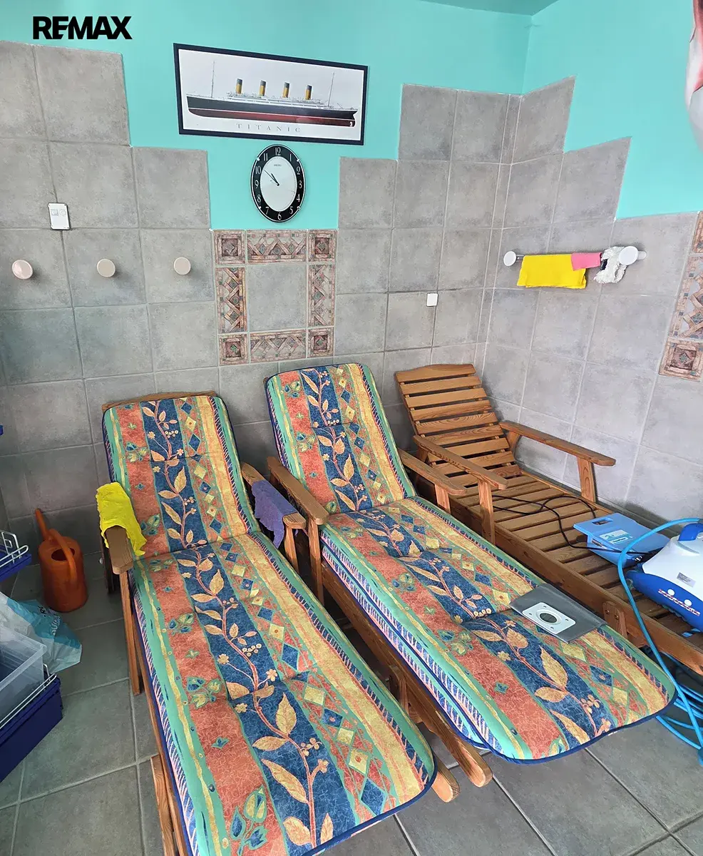Z velkého obývacího pokoje je přes místnost s bazénem přímý vstup na terasu s výhledem na okolní jihozápadní svahy. Venkovní terasa je vybudována okolo tří stran stavby, takže je možné ji využívat na několika místech. Na terase jsou umístěna sezení, udírna, květníky se záhonem a otevřené dřevníky pro skladováni palivového dřeva do krbu. Pro snadnější dopravu v případě nepříznivého počasí, nebo jen za účelem zážitkového svezení, je součástí prodeje kvalitní čtyřkolka, v zimním období s pásy.