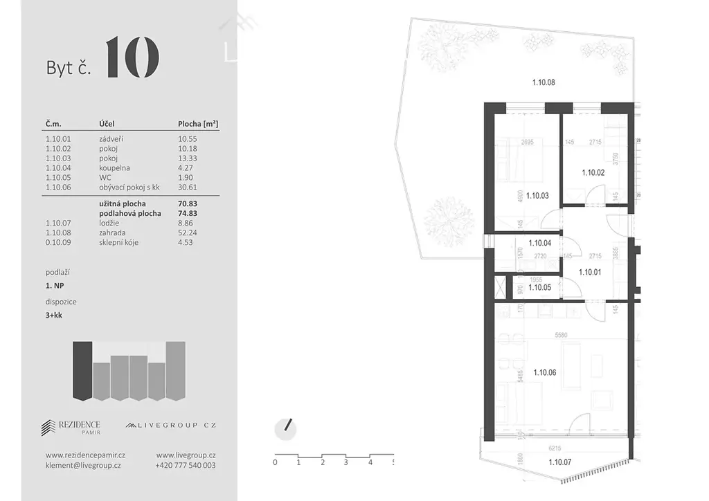 Tento byt č. 10 je umístěn v prvním 4 podlažní budovy. Jedná se o byt 3+kk s výměrou 74,83 m2 směřující na jižní a severní stranu. Obytný prostor prodlužuje zahrádka s terasou o výměře 61,1 m2. K bytu náleží sklepní prostor o výměře 4,53 m2. Ke každému bytu náleží jedno parkovací stání za 350.000 Kč a také je možnost dokoupení prostorné garáže s elektrickými vraty.