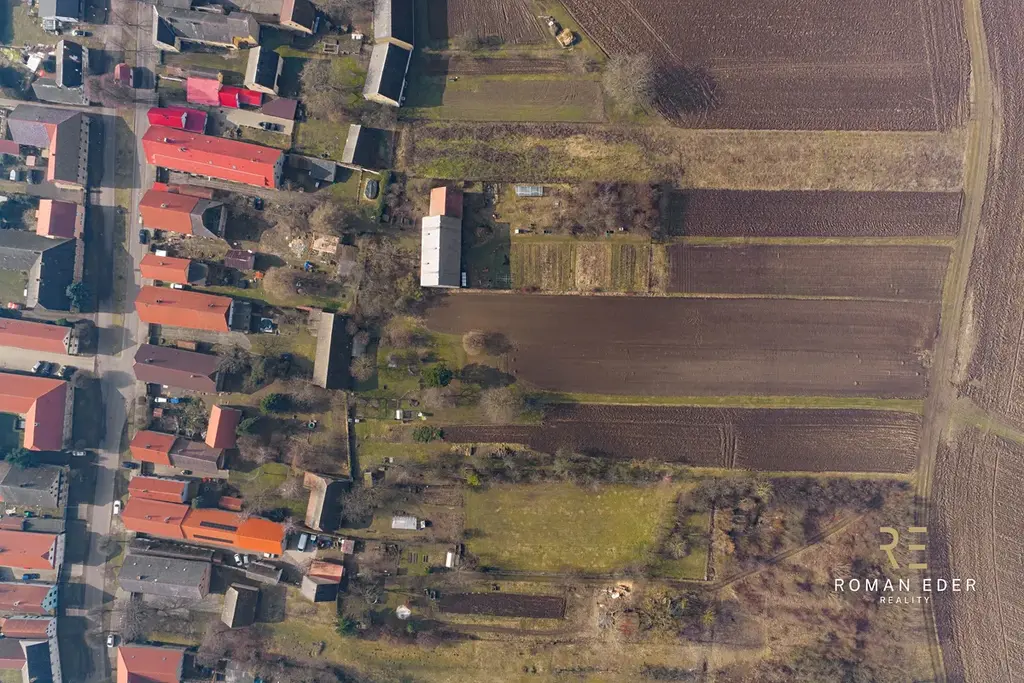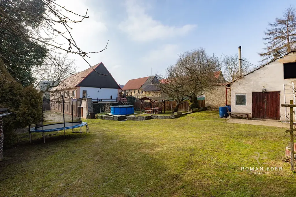 Součástí domu je také garáž a nad ní prostorná terasa s grilem, ideální pro rodinné posezení. Za domem pak naleznete velkou stodolu s dílnou. Za stodolou se pak nachází další část pozemku a navazující pole o rozloze 4 390 m², které je v současnosti pronajato zemědělcům za naturální plnění, takže se o něj nemusíte starat. Pozemek pod domem a stodolou má dalšch 1356m2.