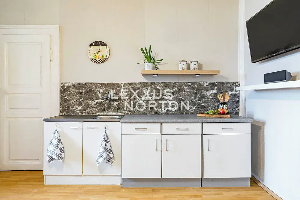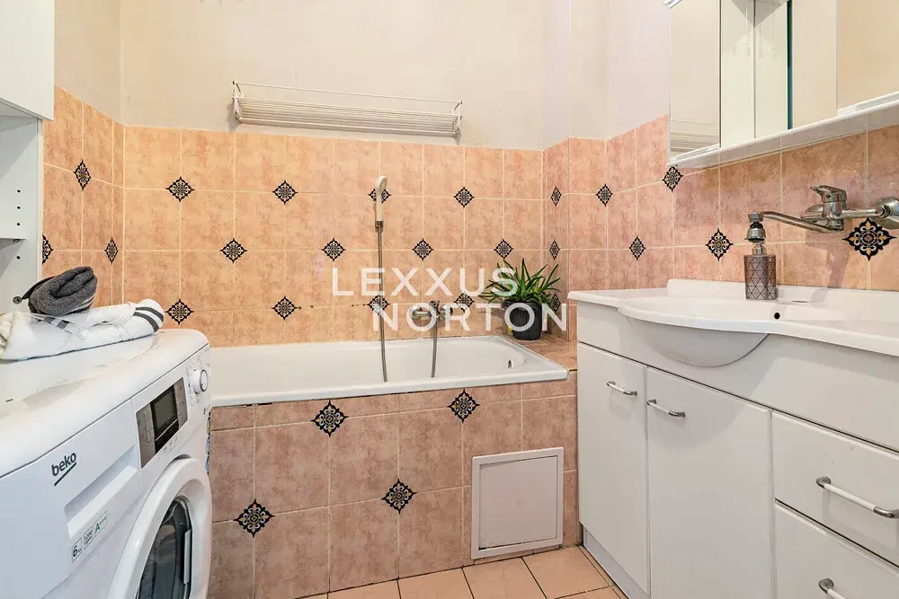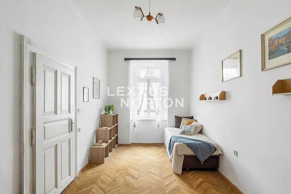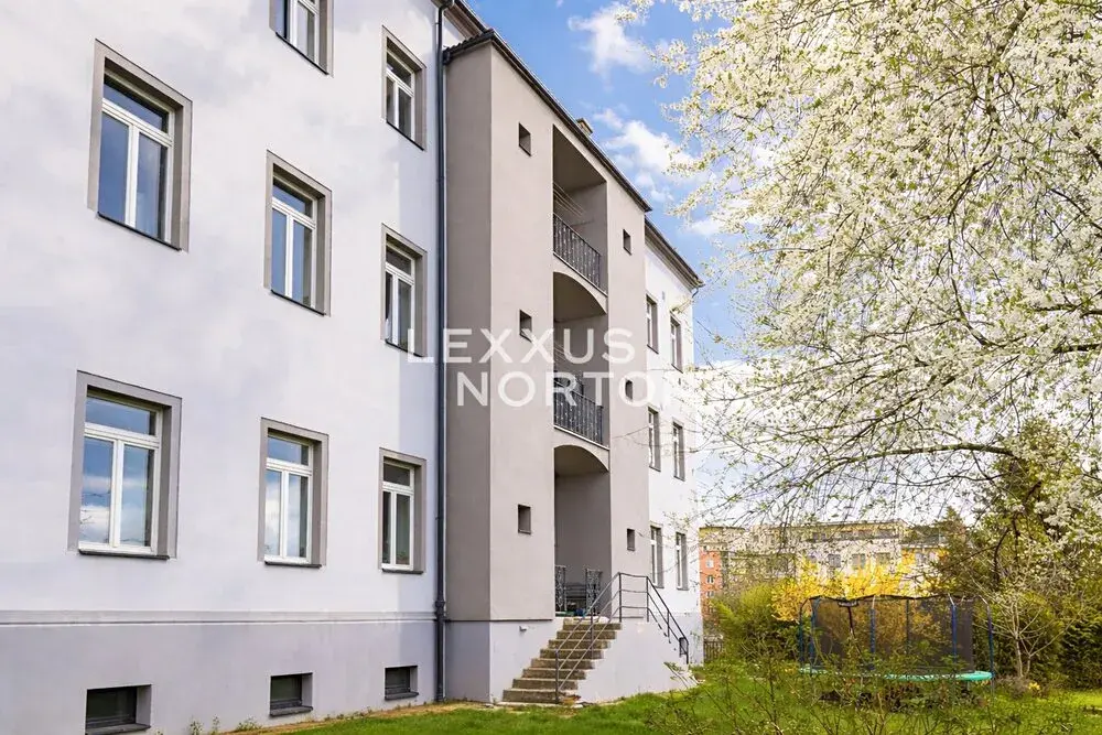 Vstup do bytu je řešený centrální pavlačí s přirozeným denním světlem, která funkčně propojuje obě původní jednotky. Dispozice aktuálně nabízí dva obývací pokoje a dvě ložnice. Samostatná kuchyně je příjemně prosvětlená velkým oknem do pavlače. Další část bytu doplňuje koupelna s vanou a oddělená toaleta. Velkým benefitem je možnost využívání společné zahrady, a navíc i s částí výhradně pro majitele bytu.