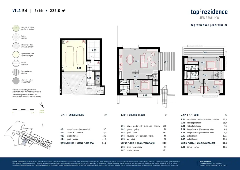 Ve standardní dispozičním uspořádání 5+kk nabízí vila typu B v 1. NP vzdušný obývací pokoj se světlou výškou 3,4 m s kuchyňským koutem, výstupem na terasu a zahradu. Přes zvýšenou galerii můžete pokračovat do hostinského pokoje s koupelnou, případně do 2. NP, kde je umístěna hlavní ložnice s terasou a vlastní koupelnou a další dva pokoje se sdílenou koupelnou.