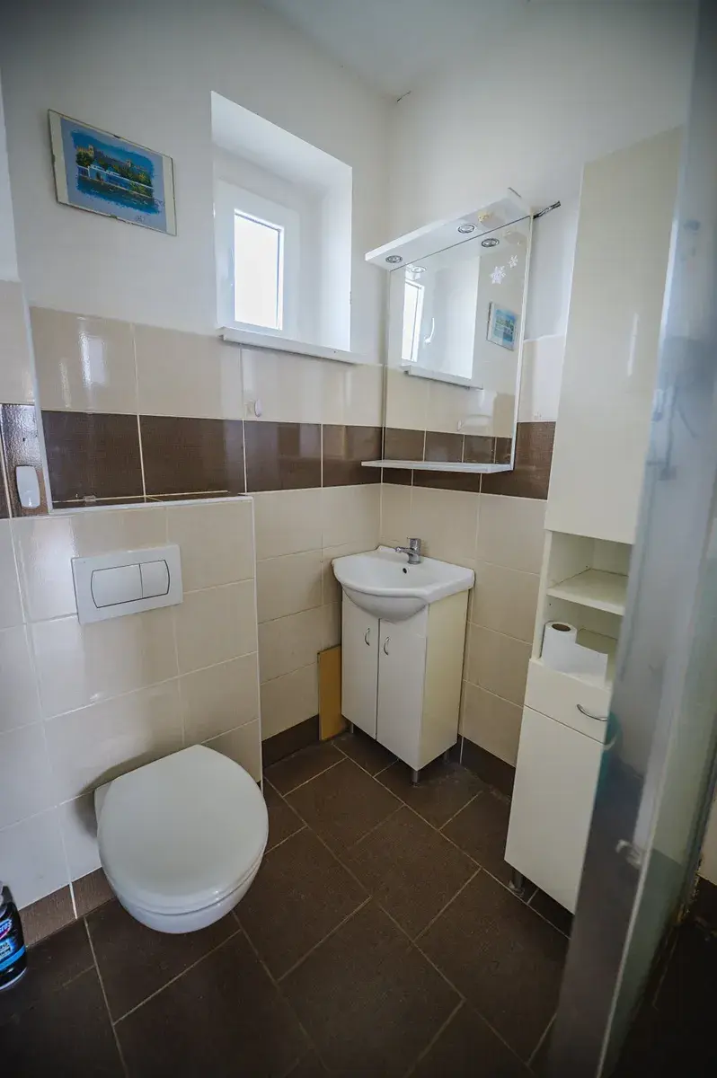 voda. Je zde WC, místo na pračku, sprchový kout a umyvadlo. V koupelně jsou 2 menší okna a díky
