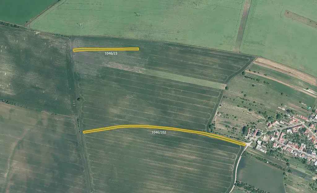 V k. ú. Těmice u Hodonína (LV 685) jsou k prodeji parcely č. 1046/15 a 1046/102 o výměře 6 993 m², vedené jako orná půda.