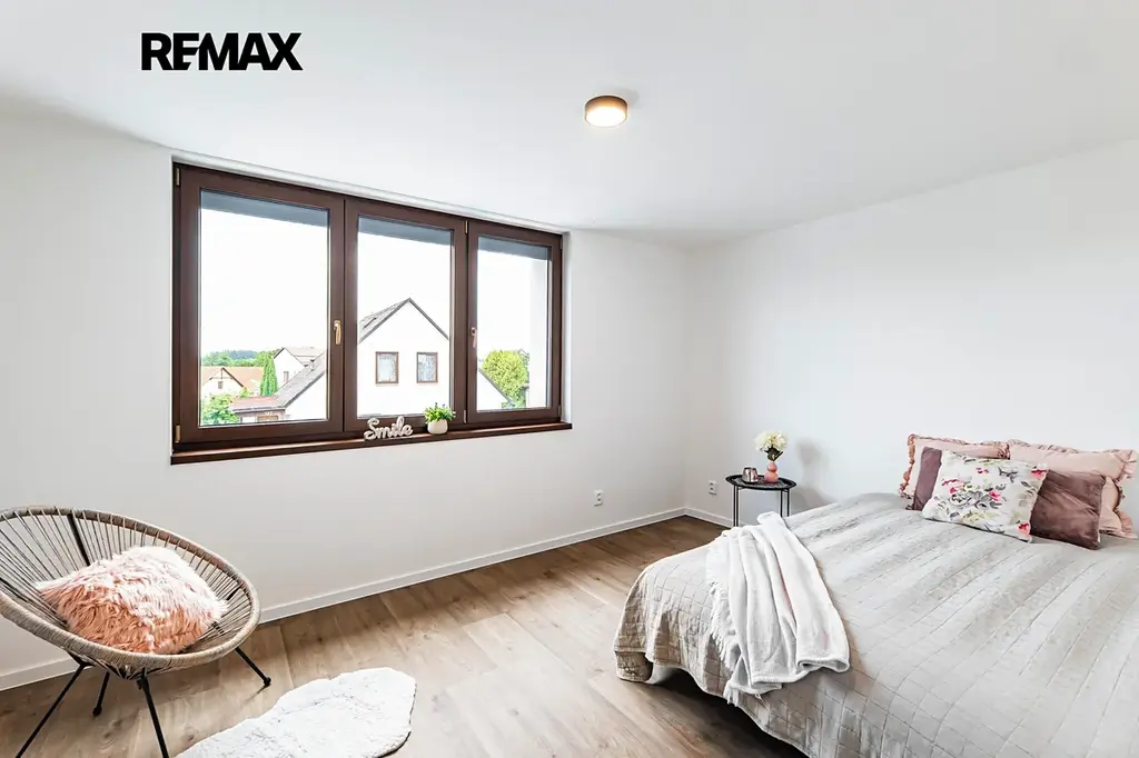 V patře se nachází další ložnice s balkonem, koupelna s vanou, praktický kumbál a tři další místností. V jedné z nich je navíc příprava na druhou kuchyni – ideální pro dvougenerační bydlení nebo při rozdělení domu na dvě bytové jednotky.