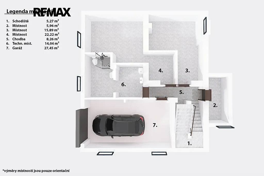 Orientační výměry jednotlivých místností jsou zmíněné v přiložených půdorysech. Spolu s tím Vám doporučujeme projít si nemovitost za pomoci 3D virtuální prohlídky, která Vám dopomůže k plné představě o rozložení jednotlivých místností.