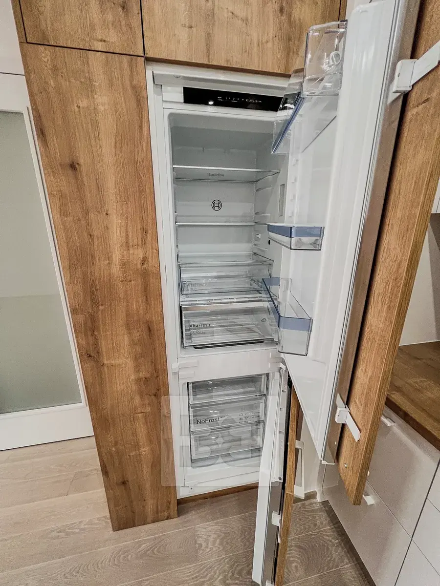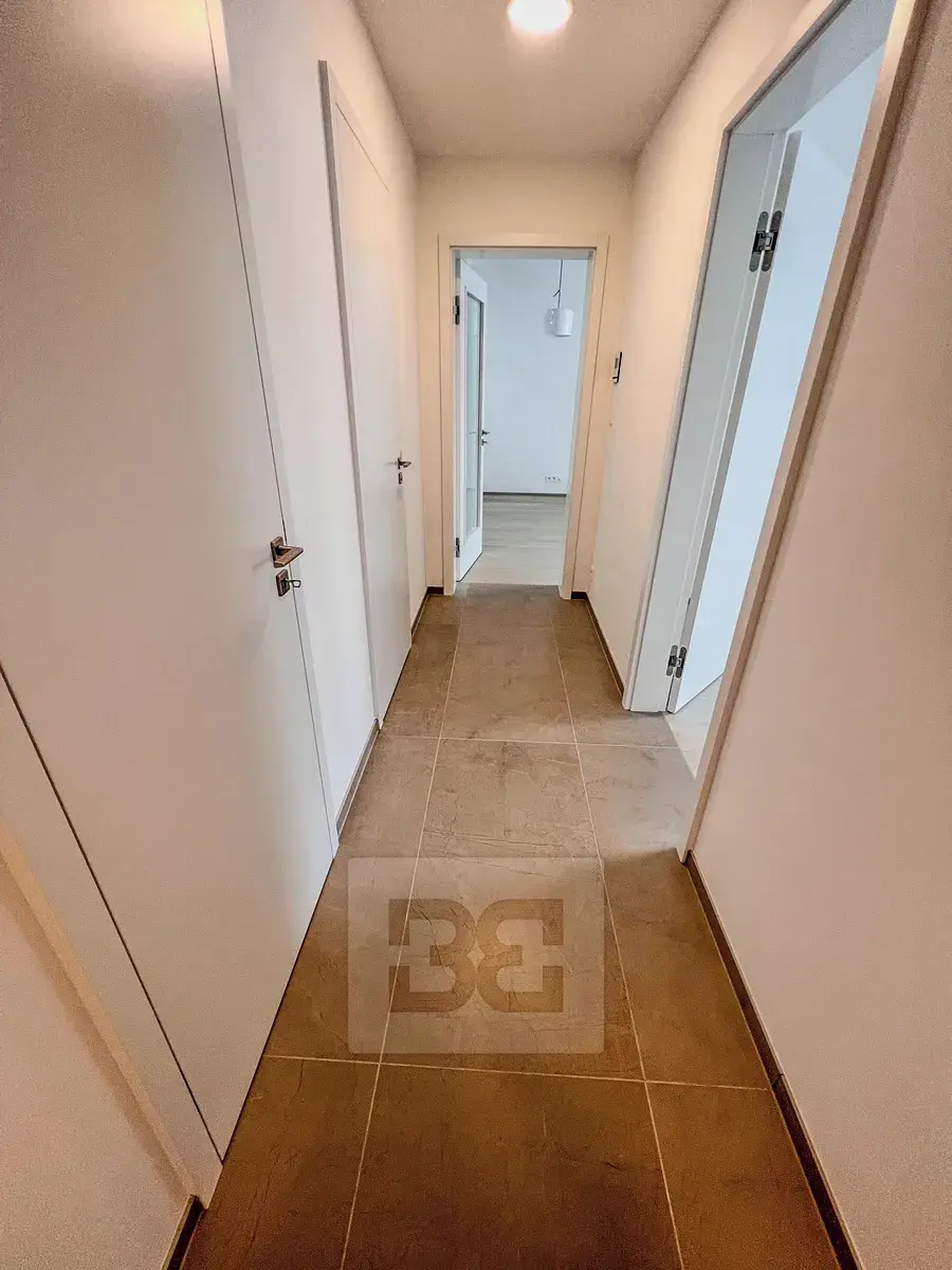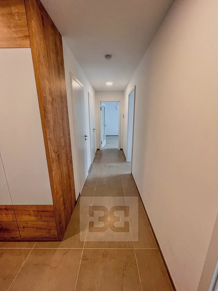 Dispozice bytu: předsíň, ze které je centrální vstup do všech místností – obývací pokoj s kuchyňským koutem a vstupem na balkon s výhledem do klidného vnitrobloku. Kuchyňská linka je plně vybavena (indukční varná deska, digestoř, elektrická trouba, mikrovlnná trouba, myčka nádobí a lednice s mrazákem). Z chodby s vestavnou skříní je dále vstup do dvou ložnic (z jedné z nich je rovněž vstup na balkon), koupelny s vanou a WC, samostatného WC s umyvadlem a také do místnosti vhodné jako šatna nebo sklad.