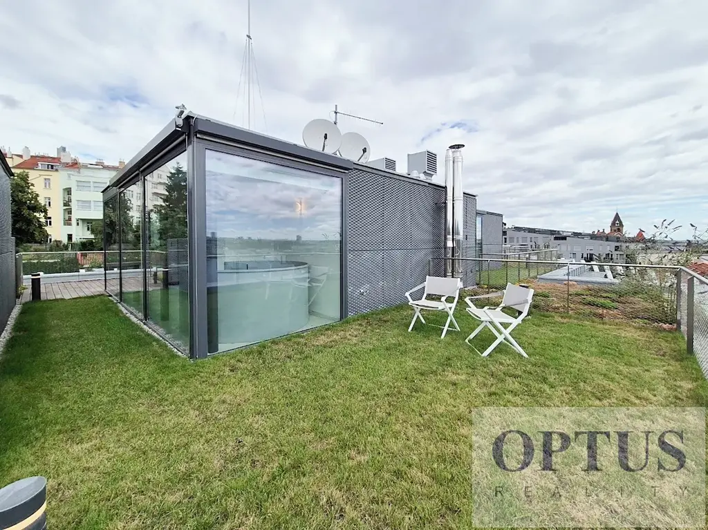 Nabízíme k pronájmu luxusní nezařízený mezonetový byt 5 + kuchyňský kout (211,70 m2) + 2 terasy celkem cca 80 m2 a střešní zahrada cca 31 m2, situovaný v 5. a 6. patře novostavby bytového domu s recepcí, ostrahou, rozlehlou terasovitou zahradou a s podzemním parkováním.
