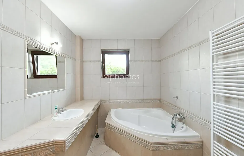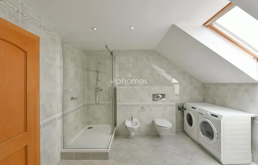 V přízemí domu se nachází prostorný obývací pokoj s jídelnou, plně vybavenou kuchyní, s přístupem na terasu a zahradu, ložnice/pracovna a koupelna ze sprchovým koutem a toaletou. V horním patře jsou další čtyři ložnice a dvě koupelny s vanou, bidetem a toaletou. Integrovaná garáž pro dva vozy.