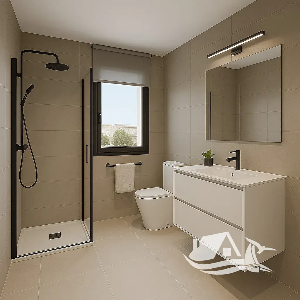 Apartmán nabízí dispozici se dvěma ložnicemi a dvěma koupelnami, což je ideální kombinace pro vlastní bydlení i pronájem. Obytný prostor s kuchyní o velikosti 25,4 m² působí vzdušně a přirozeně navazuje na terasu. Hlavní ložnice má dostatek soukromí a celý interiér je navržen s důrazem na funkčnost i čistý moderní styl. Samozřejmostí je porcelánová dlažba, vestavěné skříně, bezpečnostní vstupní dveře, videotelefon a předinstalace klimatizace vedené v potrubí. O tepelný komfort se postará aerotermální systém, který je úsporný a připravený na celoroční využití. Kuchyně je plně vybavená, nechybí úložný prostor ani parkovací stání a sklep.