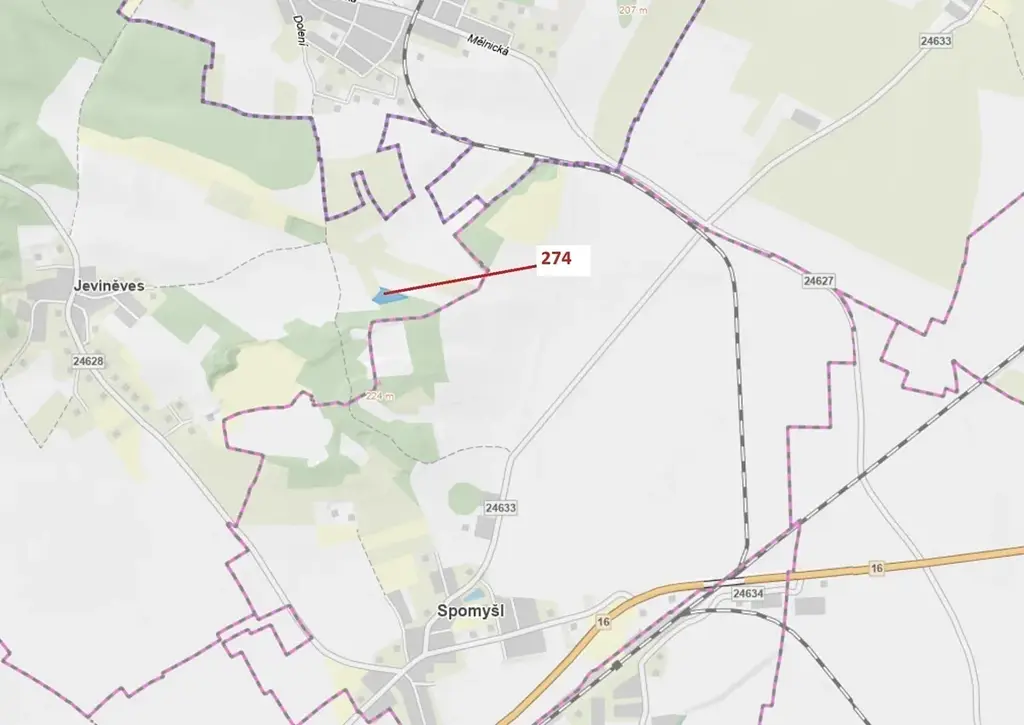 Lesní pozemek o výměře 4 557 m2, parcelní číslo 274, podíl 1/1, katastrální území Jeviněves, obec Jeviněves, obec s rozšířenou působností Mělník, okres Mělník, Středočeský kraj.