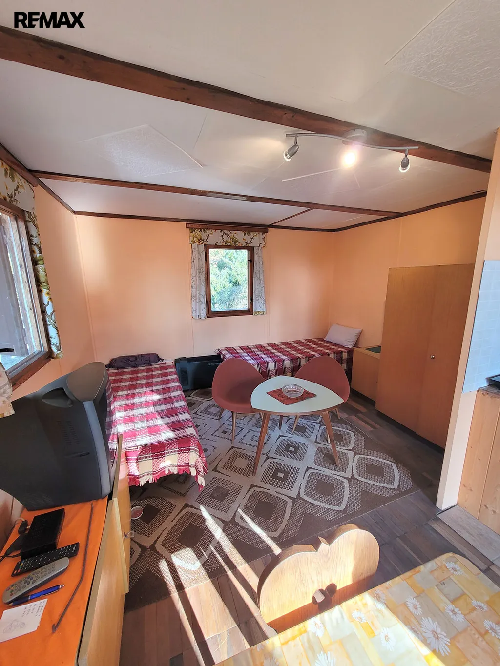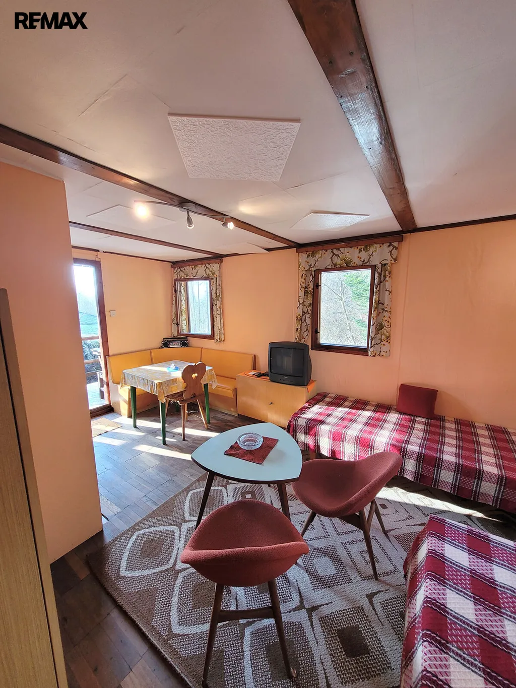 V patře se nachází jídelní kout a možnost přespání, samostatné WC je v přízemí.