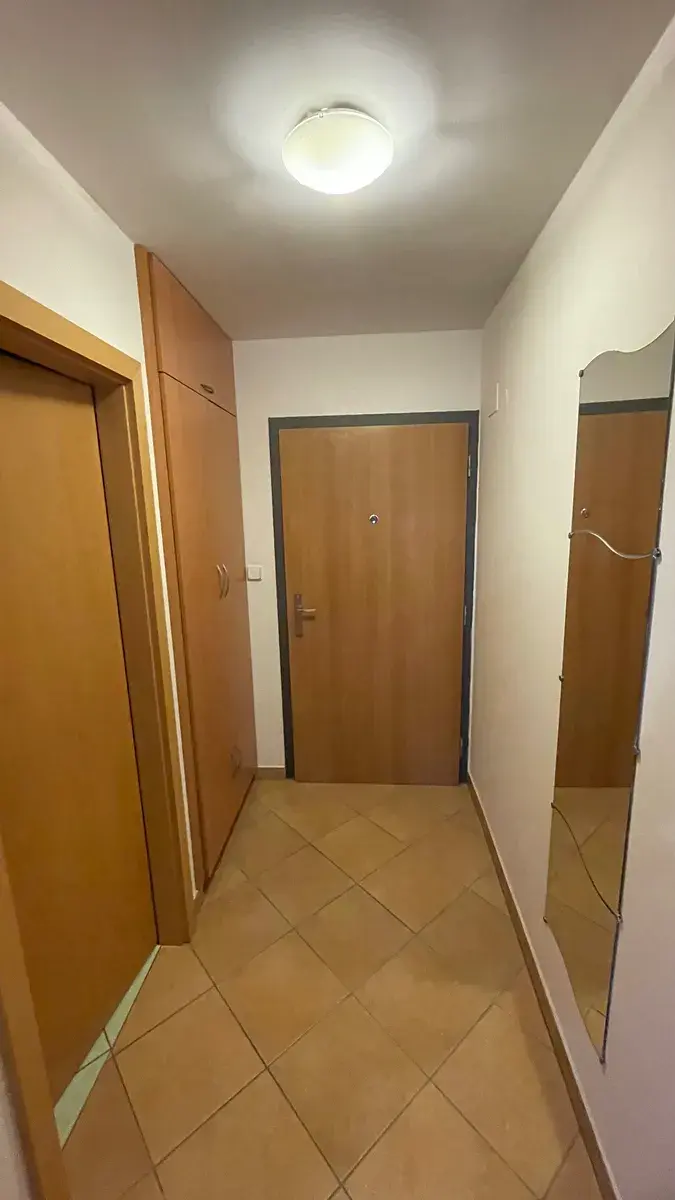 Byt dispozice 1+kk o velikosti cca 30 m2. Prostorný pokoj, součástí kterého je kuchyňská linka s vestavěnou lednicí, varnou deskou a digestoří. Z pokoje je vstup na balkon orientovaný do klidného vnitrobloku. V předsíni je velká vestavná skříň. Koupelna se sprchovým koutem a WC. K bytu náleží také sklep cca 1,5x2,5m.