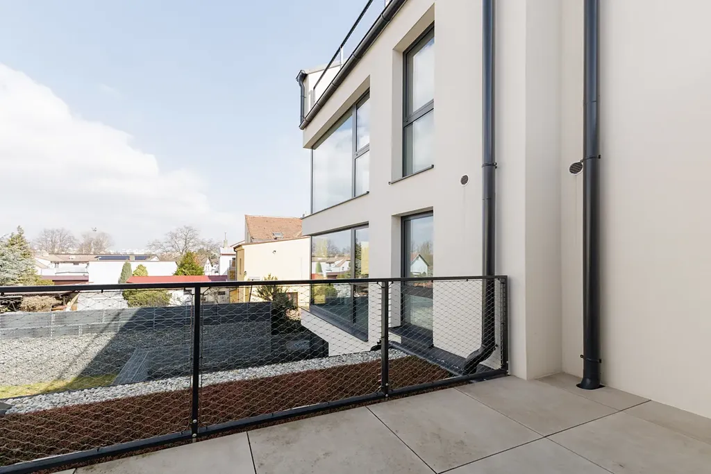 Moderní 2+kk o velikosti 70 m² s terasou 8 m². Hlavní předností bytu je prostorné uspořádání. Byt se skládá ze dvou obytných místností a čtyř samostatně oddělených místností, které slouží jako příslušenství – vstupní zádveří s šatní skříní, toaleta, šatna a technická místnost s pračkou a sušičkou značky Haier. Z ložnice, situované do klidného vnitrobloku, je přístup na terasu. Okna v obývacím pokoji jsou vybavena elektricky ovládanou fólií na bázi tekutých krystalů, která umožňuje regulaci světla a soukromí. V oknech do ulice jsou instalovány elektricky ovládané diskrétní PDLC fólie – čiré/mléčné sklo, které umožňuje regulaci světla a soukromí. K bytu náleží prostorná sklepní kóje. Dále je možné pronajmout garážové nebo venkovní parkovací stání.