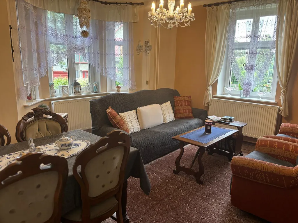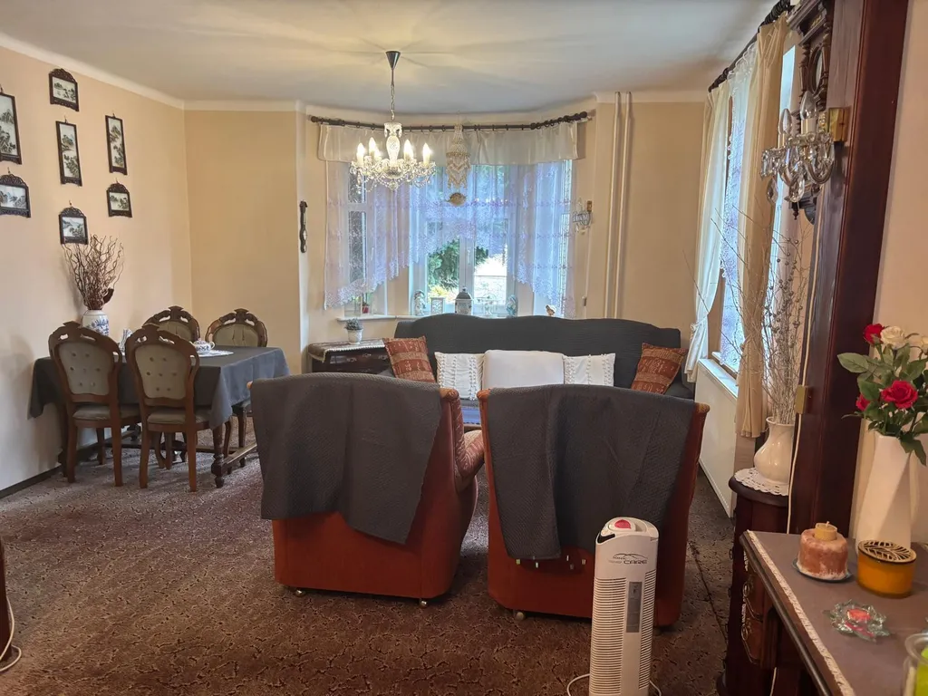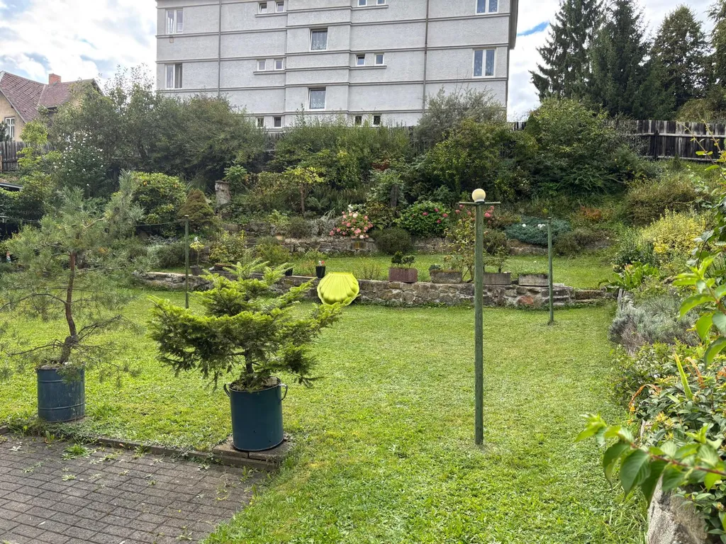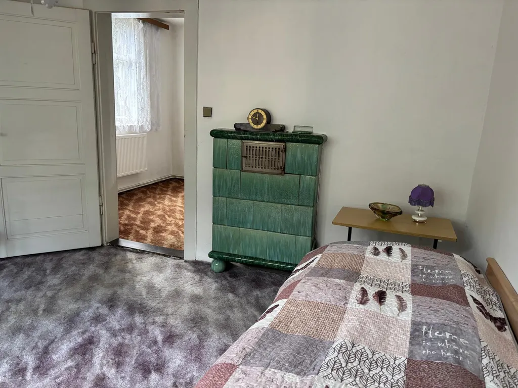 Co se týče samotného domu: V 1 NP domu se nachází veranda, chodba a vstup do velkého obývacího pokoje s arkýřem. Dříve byl pokoj rozdělen do dvou pokojů. Krásný výhled do zahrady. Vedle je malá kuchyně, koupelna a samostatné WC a dolů směr sklep, nahoru do patra, kde se nacházejí tři pokoje. Jeden pokoj plně samostatný, dva pokoje průchozí s krásným vestavěným krbem a v jednom zadním pokojíku je balkonek. Dále je zde WC a příprava na sprchový kout. Nahoru vstup na suchou čistou půdu. U domu je i rampa pro lidi s omezenou hybností.