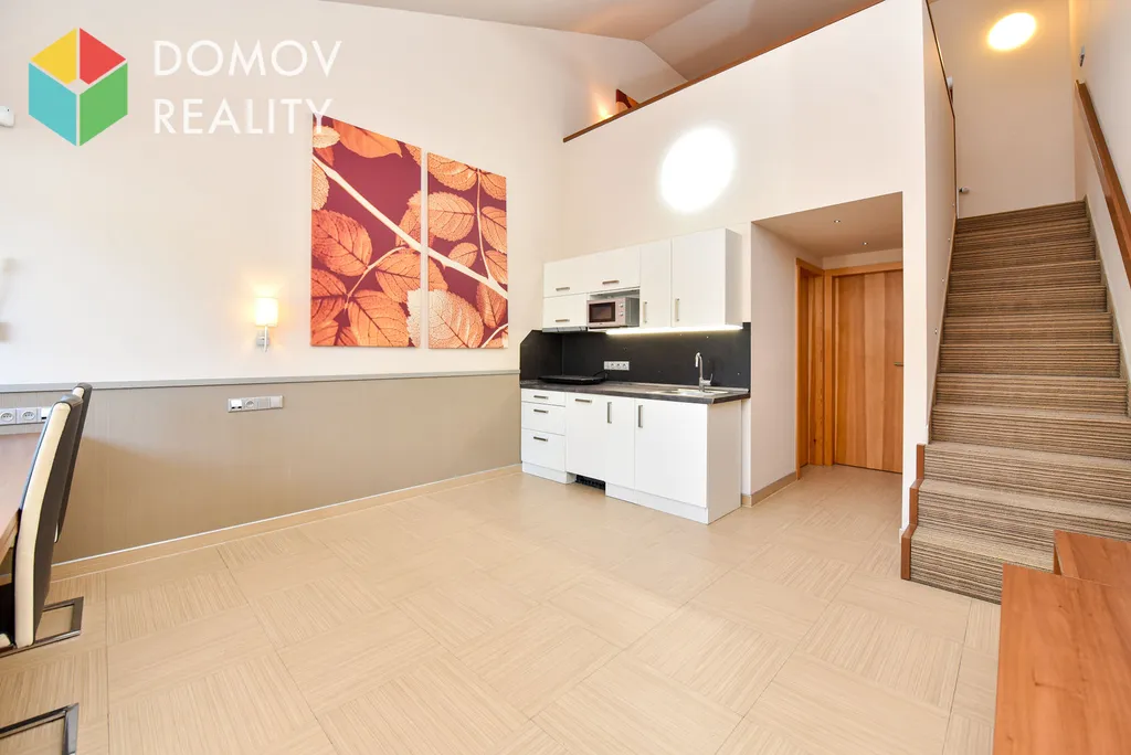 Byt se skládá z kuchyňského koutu s vybavenou kuch. linkou jejíž součástí je lednice, sklo- keramická varná deska, myčka, digestoř, mikrovlnná trouba.