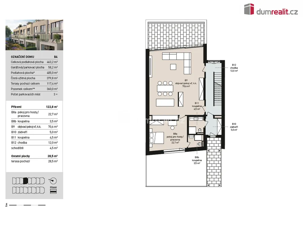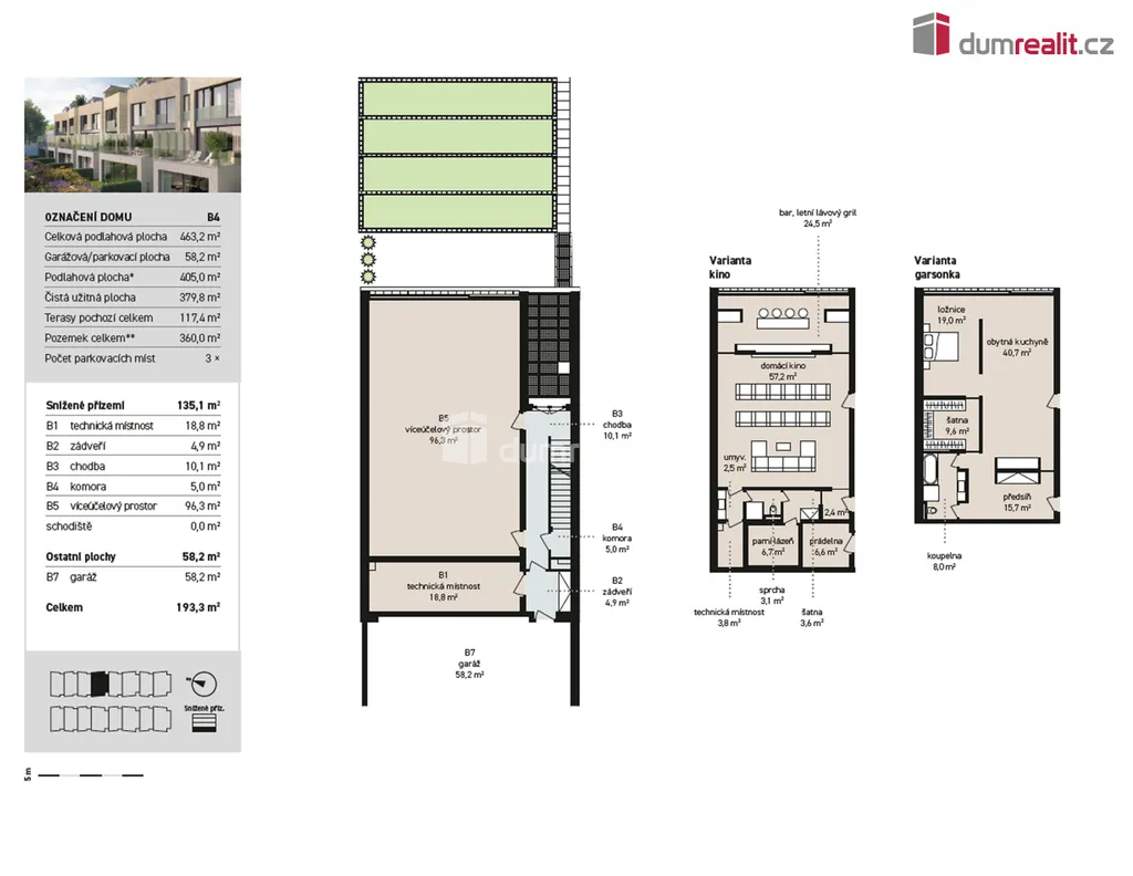 Hledáte nadstandartní dům v blízkosti budoucí stanice metra? Tak právě pro vás zde mám multifunkční, vícegenerační rodinný dům (B4) s dispozicí 6+kk v Praze 12 – Libuš, který je vzdálen pouze 2 minuty pěšky od budoucí stanice metra D - Libuš a je v uzavřeném rezidenčním areálu s dalšími 15 domy. Celková podlahová plocha domu je 378 m², jsou zde dvě terasy (145 m²), plocha pozemku je 261 m² z toho zahrada má celkem 188 m². Dispozice tohoto moderního, nízkoenergetického domu tvoří v přízemí: prostorný obývací pokoj + kk (70,6 m²) se vstupem na terasu (28,5 m²), pracovna (22,7 m²) s vlastní koupelnou s WC (3,5 m²), dále společná koupelna (4,5 m²) a zádveří (5 m²). Po schodišti (12 m²) obloženém dřevem se dostaneme do 1. patra (2NP), kde je hlavní ložnice (18,5 m²) s šatnou (10,1 m²) a vlastní koupelnou s WC (10,7 m²), dále pak šatna (4,8 m²), hala (10,3 m²) a dva dětské pokoje. První pokoj (18,4 m²) má vlastní koupelnu (5,1 m²) s WC, druhý pokoj (19,6 m²) má také koupelnu (5,1 m²). Přes samostatnou chodbu (11,7 m²) se dostaneme ke schodišti (7,6 m²) do 2. patra, kde se nachází panoramatická terasa 116,4 m², která je z části krytá (prostor sprchu nebo vířivku) a je orientována na východ, sever a západ. Z obývacího pokoje se po schodišti dostaneme do suterénu domu, kde je multifunkční místnost, kterou můžete zcela upravit podle svých potřeb. Tato místnost má nadstandartních 96,3 m² a můžete zde mít opravdu cokoliv – např. samostatnou bytovou jednotku 1+kk s koupelnou a WC, kinomístnost, karaoke, panský klub, fitness, vnitřní bazén a nebo svoji soukromou pracovnu (např. pro advokáty, architekty, projektanty, daňové poradce apod.). Tato místnost je nedokončená a je připravena na úpravy dle vašich představ. Místnost má také přístup přímo z garáží – velmi výhodné. V suterénu domu je dále chodba (4,9 m²) se zádveřím a sklep / tech. místnost (18,8 m²) a komora (5 m²), kde je umístěný plynový kondenzační kotel. Ze suterénu je také vstup na zahradu (144 m²), která je kaskádovitá. Další zahrada je před vstupem do domu (44 m²) ve vnitrobloku. V celém domě je podlahové topení, okna jsou dřevěná, v obývacím pokoji a na terase je HS portál, u všech oken je příprava ne před okenní žaluzie, v domě je zavedeno optické vlákno na internet, podlahy jsou dřevěné vč, obložení schodiště. Vstupní dveře do domu jsou bezpečnostní, interiérové pak také dřevěné s obložkami. Osobně mohu doporučit, můj velmi blízký přítel zde bydlí, rád vám jako zájemci o koupi může předat další informace. Celý projekt je umístěn na konci slepé ulice se vstupem do budoucího parku. Stanice metra D - Libuš bude v docházkové vzdálenosti - realizace 2032. Velmi vám doporučuji prohlídku tohoto domu 6+kk (378 m²), který vás svou velikostí ohromí, dispozicí nadchne, a nakonec chytí za srdce. Kompletní prezentace je na našich webových stránkách. Ev. číslo: 655338.
