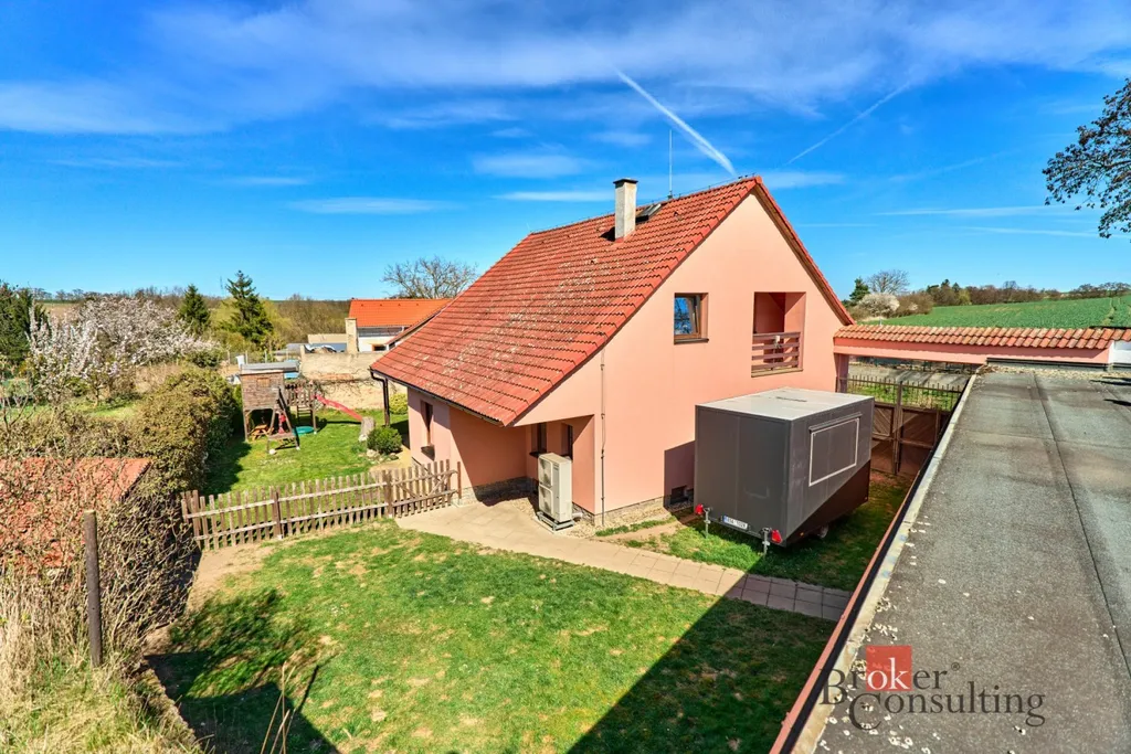 K domu náleží prostorná zahrada, na které se nachází zahradní domek poskytující další úložný prostor, skleník a vzrostlé ovocné stromy (meruňky, třešně, jabloně). Pro rodiny s dětmi je zde připravena i dětská prolézačka. Na pozemku je rovněž vrtaná studna s možností obnovení využití.