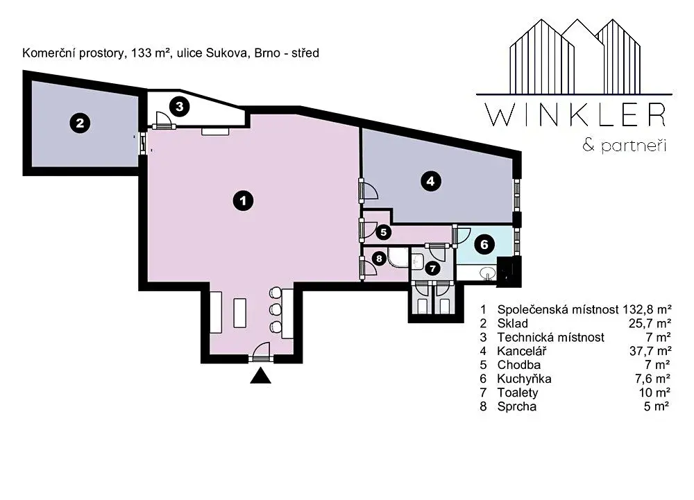 V blízkosti pěší zóny v centru Brna a zároveň pár metrů od zastávky MHD nabízíme k pronájmu reprezentativní, klimatizované obchodní prostory na Sukove ulici, vhodné jako openspace, kongresový sál, taneční sál, společenská místnost, místo pro konání konferencí a seminářů, různá školení a tak podobně.