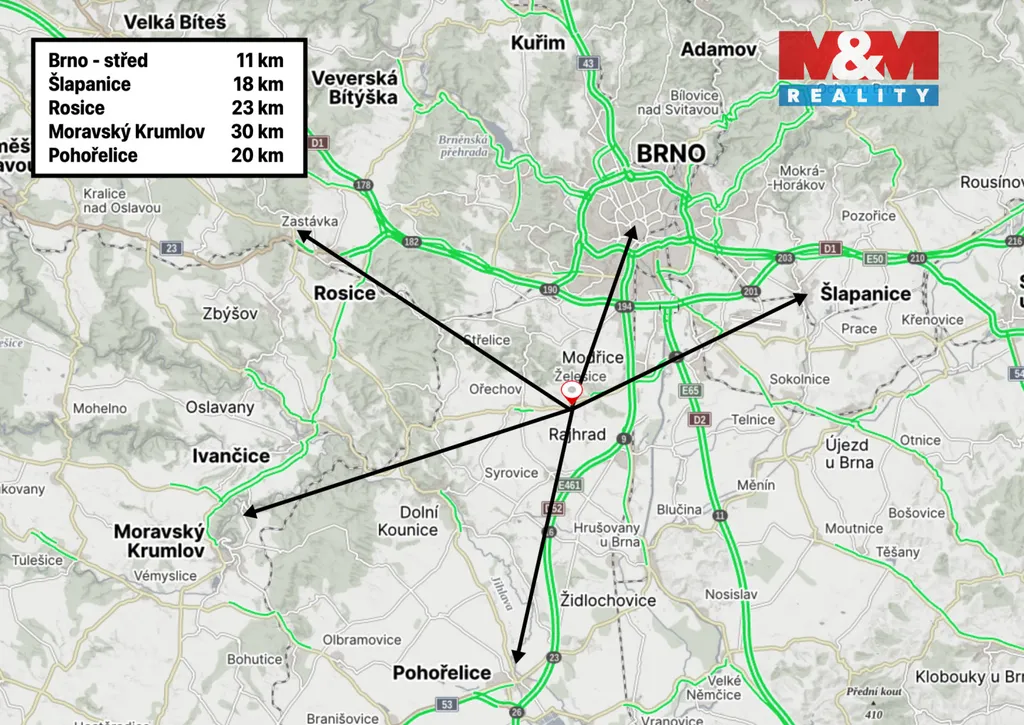 Výhodou je dobrá dostupnost do Brna a zároveň klidná lokalita mimo městský ruch.