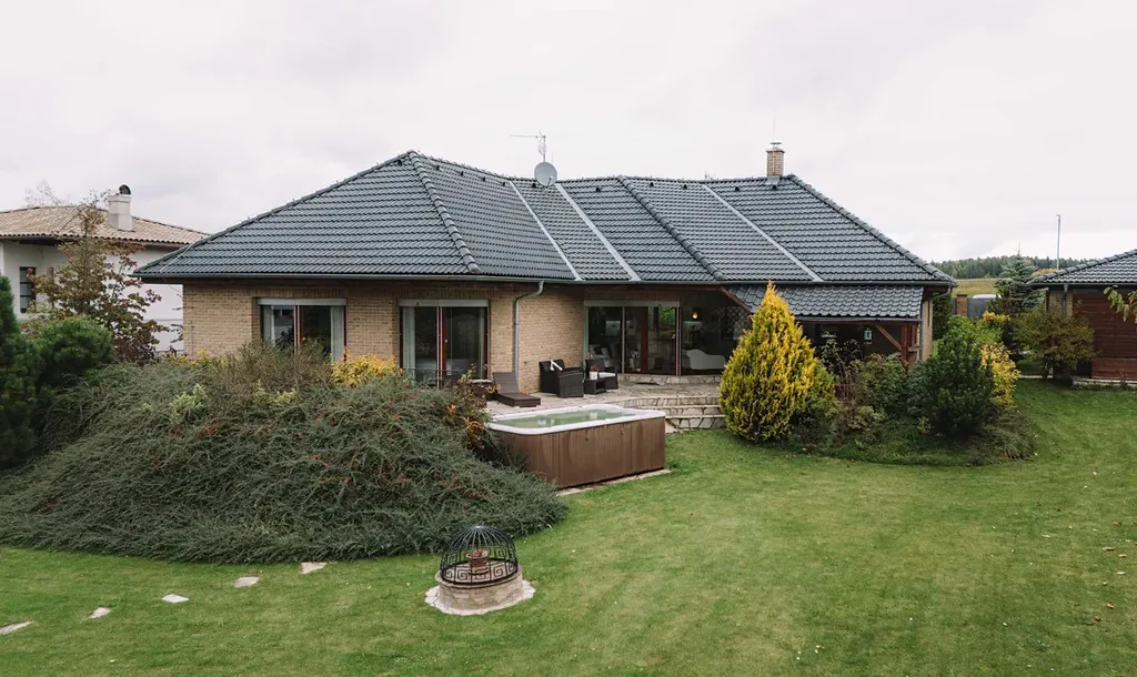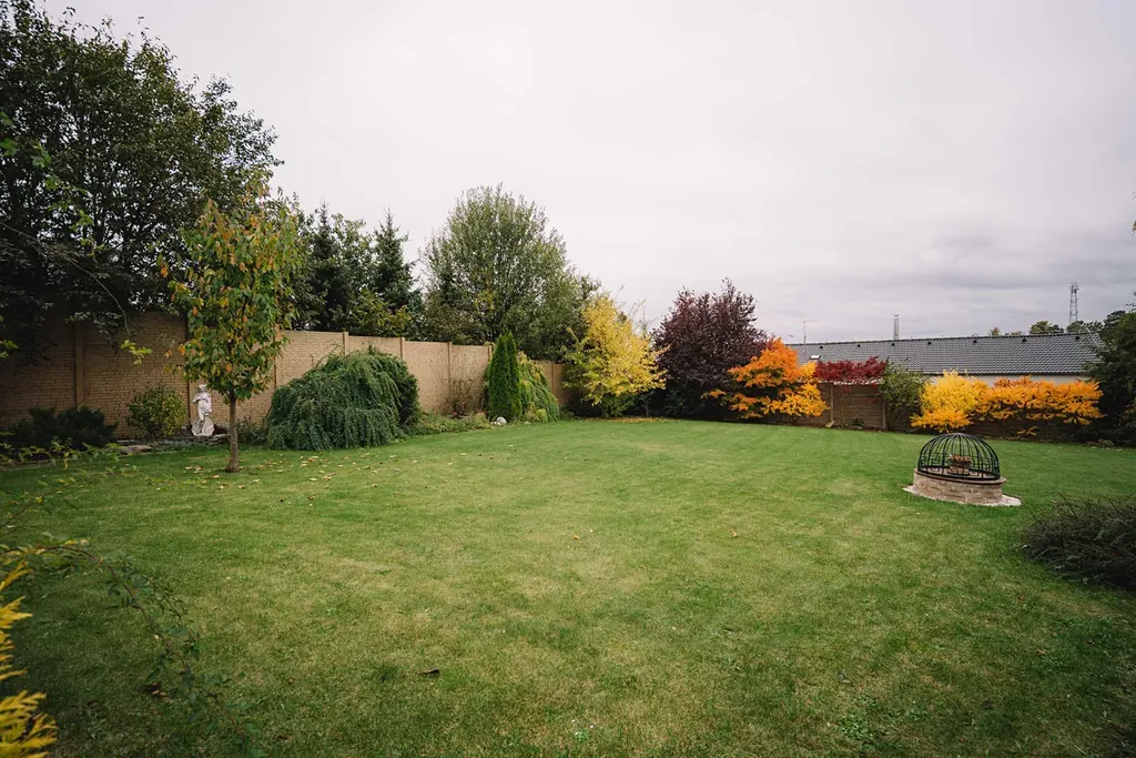 Zahrada je opravdovou oázou klidu – díky vzrostlým stromům a betonovému plotu nabízí naprosté soukromí. Vychutnáte si tu grilování, koupání ve vířivce nebo večerní posezení u ohně.