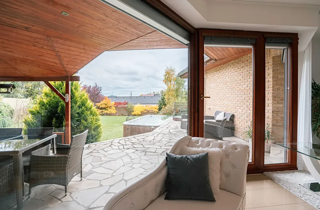 Kolem domu se rozprostírá prostorná terasa s posezením a grilem, na kterou lze vstoupit z každé místnosti a je z ní krásný výhled na okolní krajinu.
