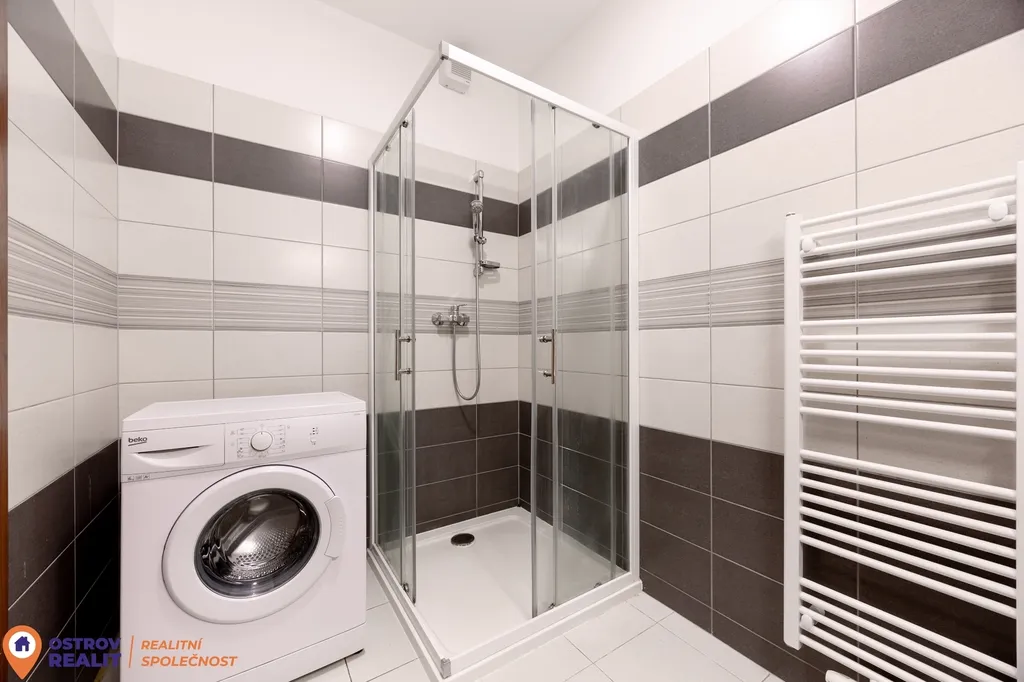 obývací pokoj s kuchyňskou linkou (s přípravou pro myčku), samostatná ložnice, koupelna se sprchovým koutem, samostatné WC, menší komora přímo v bytě.