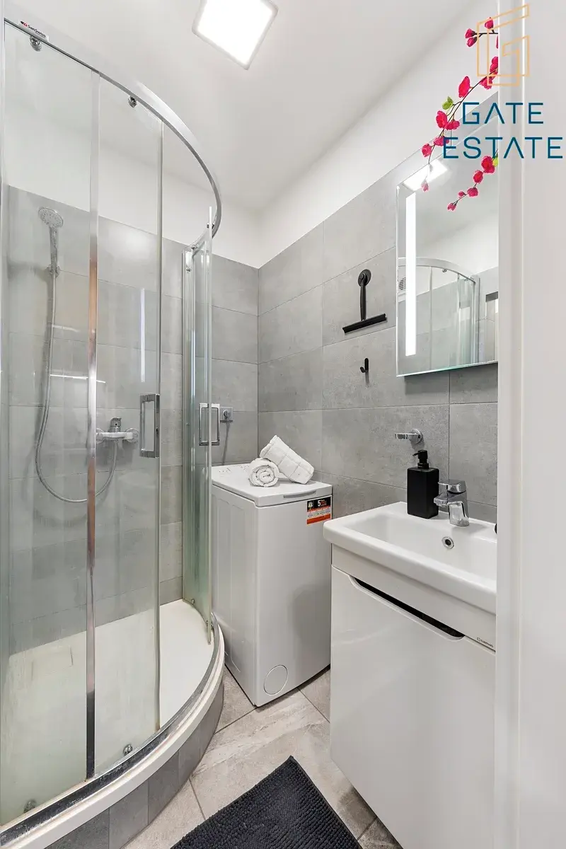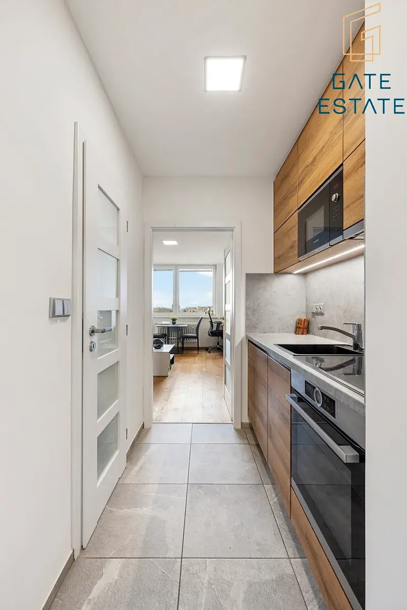 Kuchyně je samostatná a vybavená linkou na míru včetně vestavěných spotřebičů značky BOSCH. Koupelna je řešena prakticky – sprchový kout, toaleta a prostor pro pračku.