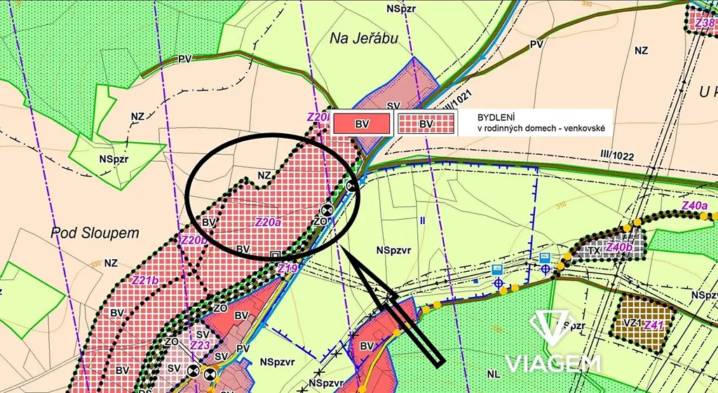 Pozemky jsou v územním plánu vedené jako BV (bydlení venkovské), koeficient zastavitelnosti je 25% pozemku. Je možné postavit 1 nadzemní podlaží + podkroví nebo podsklepení. Minimální velikost stavebního pozemku je 800 m2