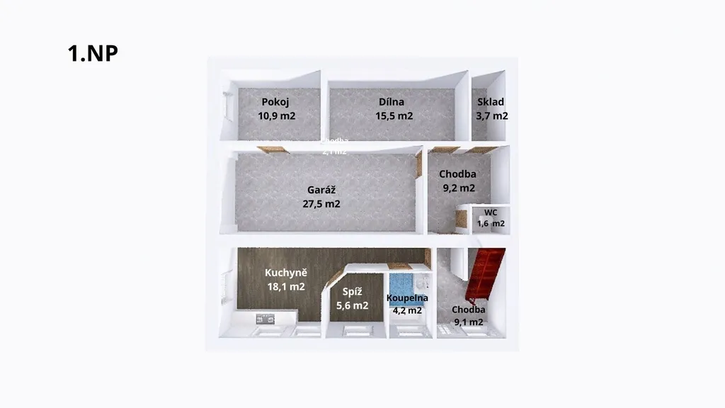 1. NP: vstupní chodba, koupelna, místnost s kuchyňským koutem, tři další místnosti, samostatné WC a garáž.