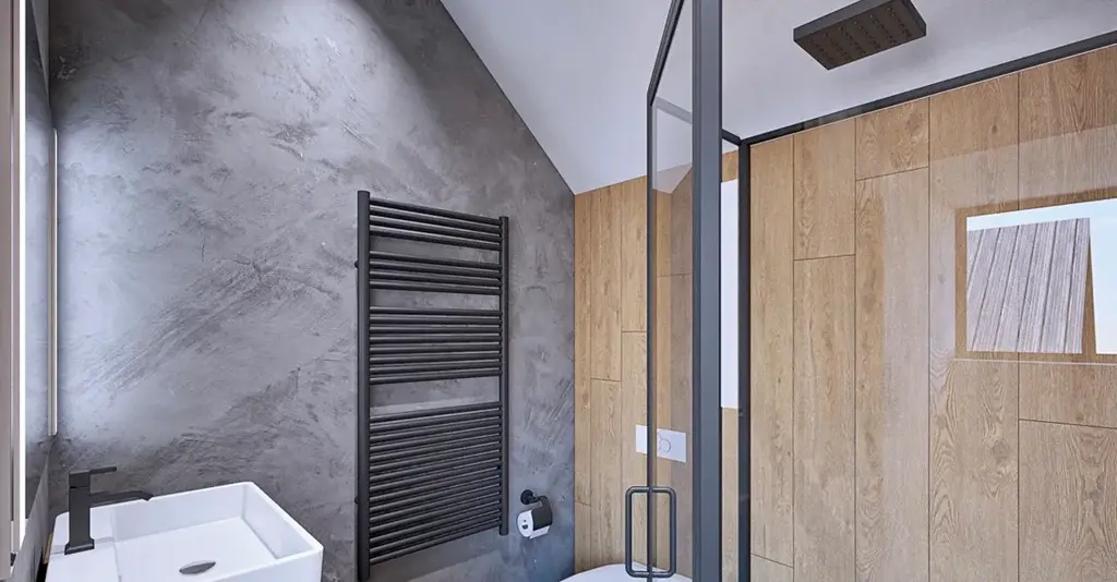 Koupelna a WC zabírají 3,43 m² a mají keramickou podlahu a obklad.