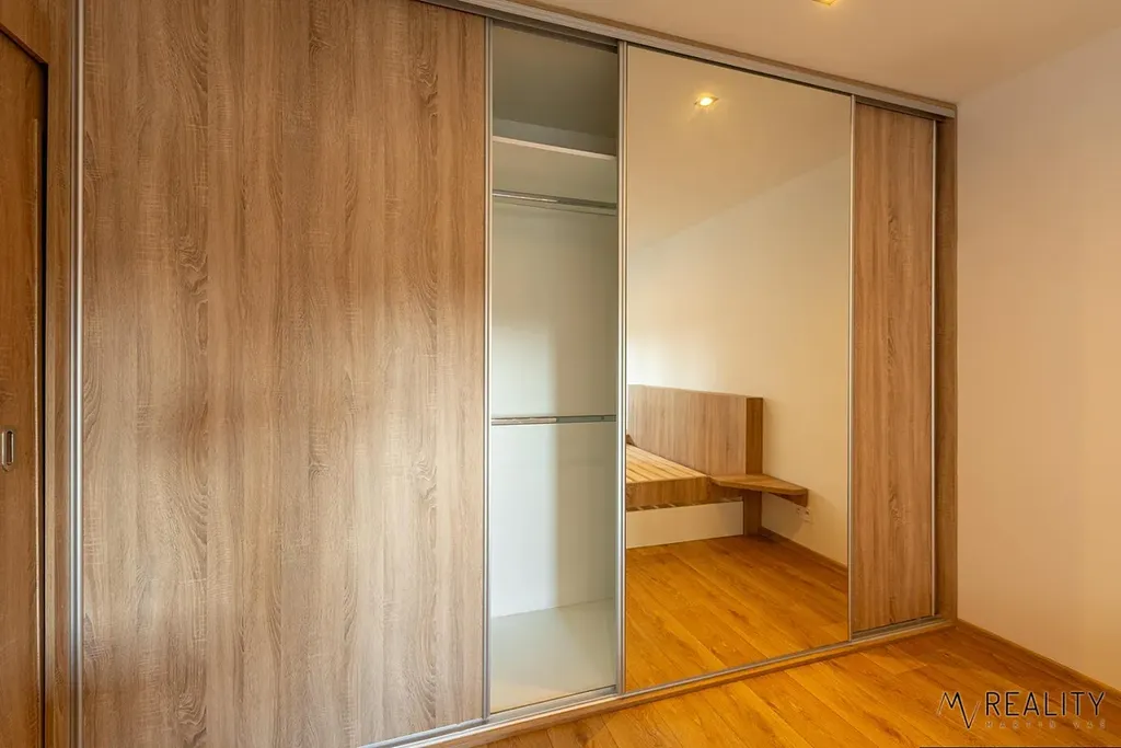 Ložnice se pyšní velikou vestavěnou skříní poskytující dostatek místa na vše, co budete potřebovat, manželskou postelí a televizní skříňkou.