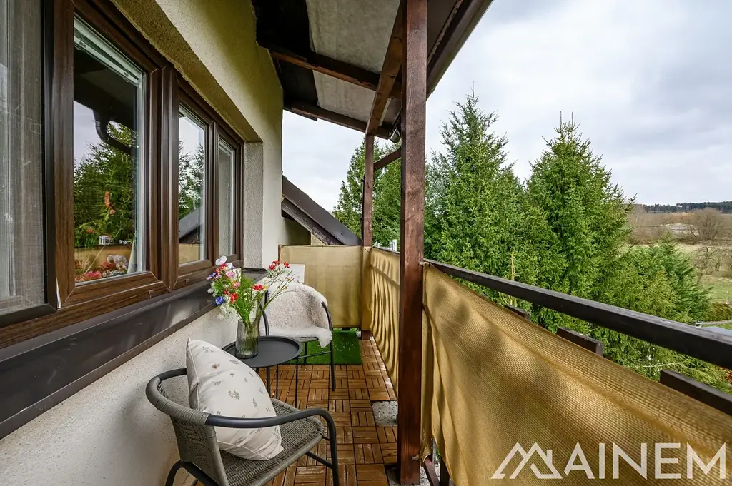 Byt se nachází v klidném prostředí mimo hlavní ruch, s krásným výhledem z každého okna i balkonu do okolní přírody.