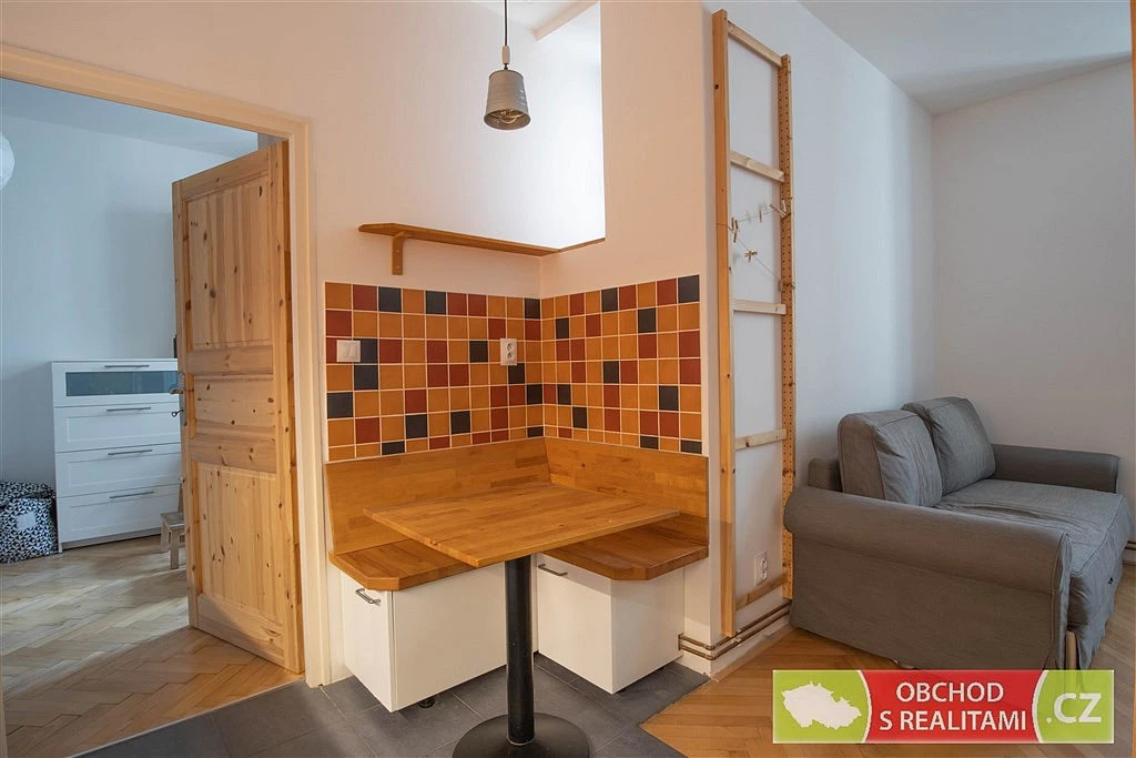 Plně zařízený byt s dispozicí 2+KK o velikosti 36 m² se nachází na adrese U Uranie 1414/4, Praha 7 / Holešovice v 1. patře s okny orientovanými do klidného vnitrobloku (žádný hluk z ulice).