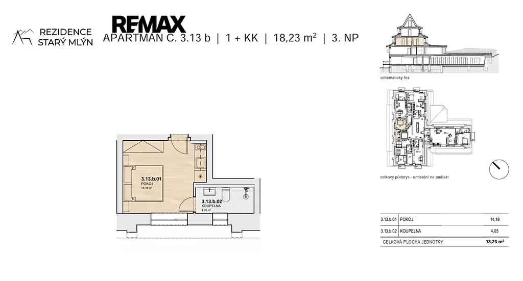 Prezentovaný apartmán č. 13b o dispozici 1+KK se nachází ve 3NP a disponuje podlahovou plochou 18,2 m². K apartmánu dále náleží privátní uzamykatelná kolárna + lyžárna (2,5m²), možnost využívání společného wellness. Cena za apartmán je uváděna včetně parkovacího stání (v hodnotě 400tis Kč) a DPH s možností odpočtu ve výši 21%. Aktuálně nabízíme voucher na kuchyňskou linku v hodnotě 100 tis Kč. Stavba byla již zahájena a plánované dokončení je do konce roku 2026.