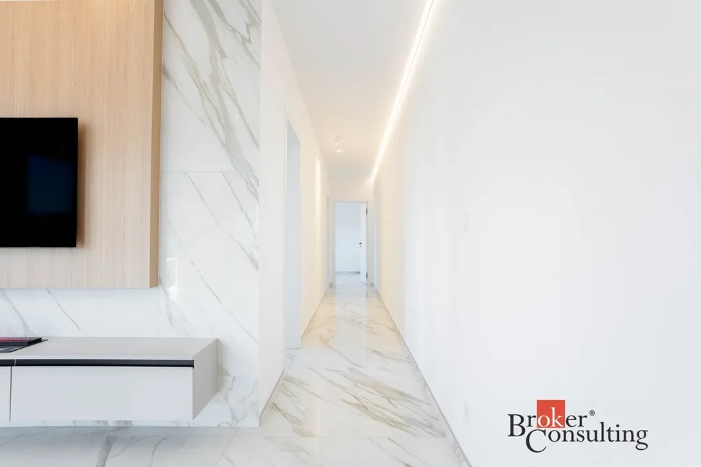 Prostory disponují dvěma designovými koupelnami – jedna s vanou a toaletou, druhá se sprchovým koutem a toaletou. Elegantní vstupní chodba s dostatkem úložných prostor podtrhuje reprezentativní charakter celého prostoru.