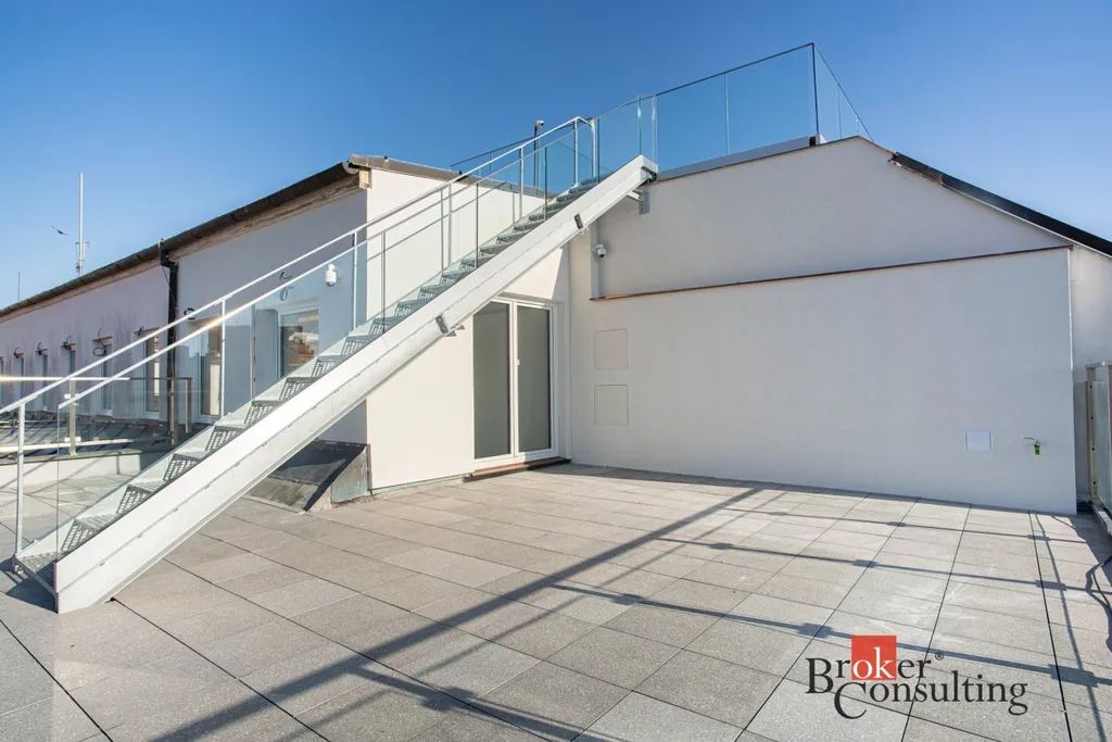 Dominantou je velkorysý open-space prostor s možností variabilního uspořádání pracovních míst či jednací zóny. Součástí je také moderní kuchyňka vybavená kvalitními spotřebiči, vhodná pro zaměstnance i neformální schůzky. Z hlavního prostoru je přímý vstup na soukromou terasu v horním patře, která nabízí ideální zázemí pro odpočinek, networking nebo firemní setkání, a zároveň poskytuje atraktivní výhled na centrum města.