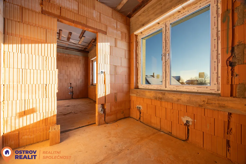 Stavba je ve velmi pokročilé fázi – dům má hotovou světlou fasádu, je kompletně osazen plastovými okny s izolačním trojsklem, vchodovými dveřmi i garážovými vraty. Elektroinstalace je rozvedena a aktuálně probíhají práce na vnitřních částech domu.