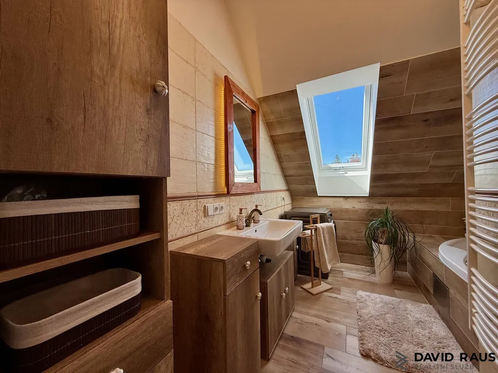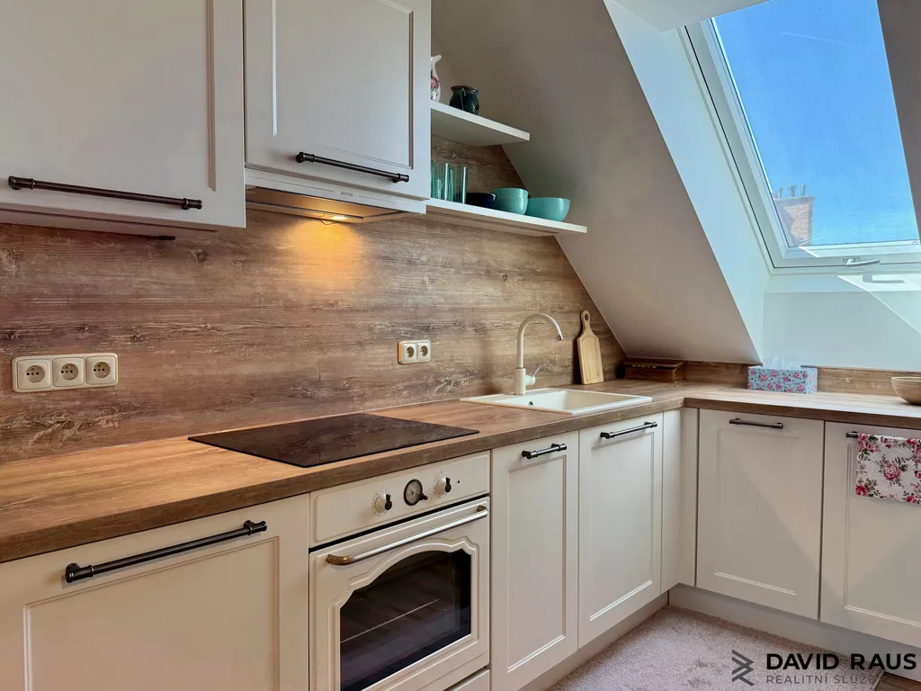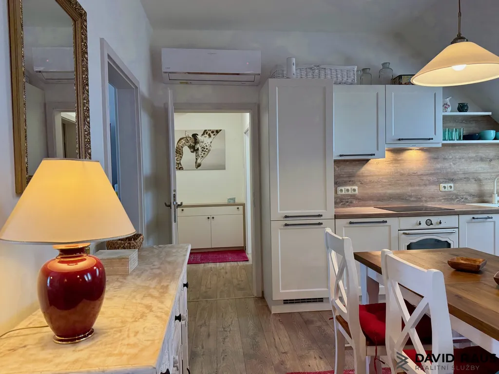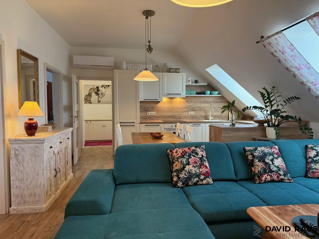 Dispozice 3+kk: Po vstupu do bytu vás přivítá předsíň s vestavěnou skříní, ve které je elegantně ukrytý bojler, takže nenarušuje čistý vzhled interiéru. Z předsíně vstoupíte do hlavní obytné části – obývacího pokoje s kuchyňským koutem a jídelní zónou. Tento prostor působí velmi útulně a harmonicky, díky světlé výmalbě, přírodním materiálům a celkovému sladění interiéru. Je to místo, kde se budete cítit příjemně od prvního okamžiku. I zde je k dispozici klimatizace pro maximální komfort v letních měsících. Byt nabízí ložnici s klidnou atmosférou, ze které je přímý vstup na balkon – ideální místo pro ranní kávu i večerní odpočinek. Také zde je instalována klimatizace. Další samostatný pokoj může sloužit jako dětský pokoj, pracovna nebo pokoj pro hosty a stejně jako ostatní místnosti je vybaven klimatizací. Součástí bytu je také koupelna, která je laděna do jemných přírodních tónů v kombinaci světlé keramiky a dekoru dřeva. Dominantou prostoru je vana pro pohodlnou relaxaci a celkový dojem podtrhují stylové baterie ve vintage duchu, které odkazují na francouzský design. Díky střešnímu oknu je koupelna krásně prosvětlená a působí vzdušně a příjemně. K dispozici je také samostatné WC.