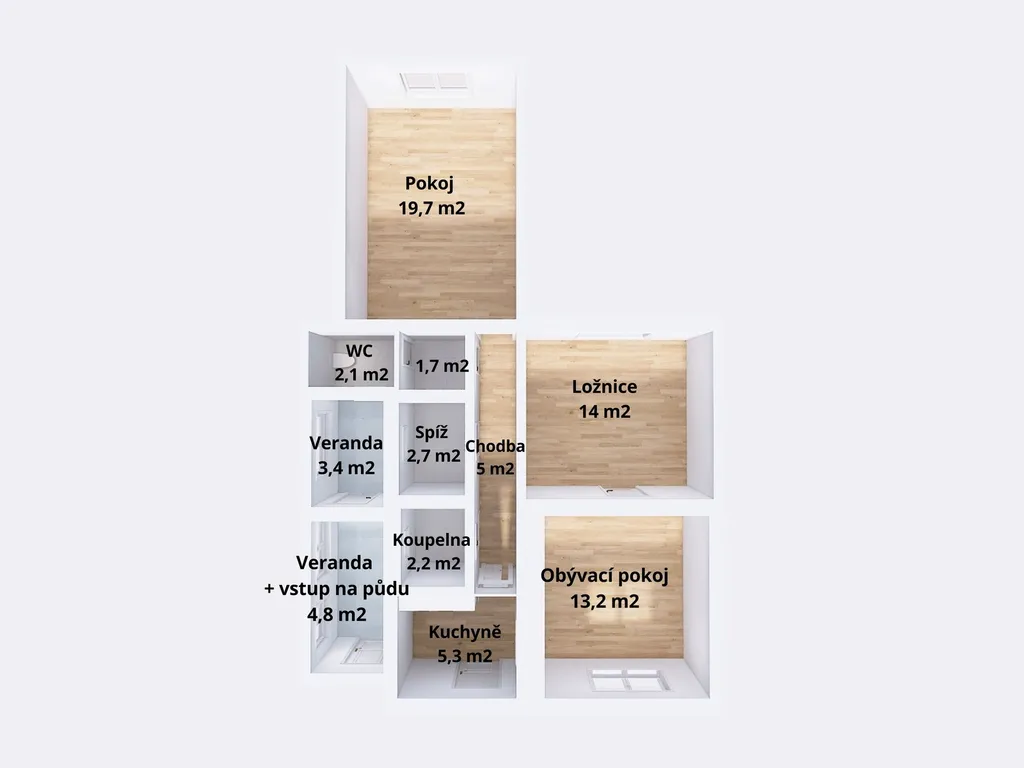 Obytná část o výměře 74 m² stávající se z kuchyně, obývacího pokoje, ložnice, koupelny, wc , šatny a chodby.