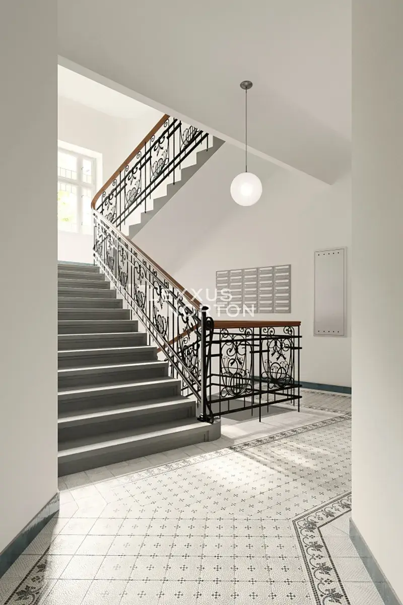 Rohový secesní dům prošel kompletní a citlivou rekonstrukcí se zachováním původních architektonických detailů ve společných prostorách. Nový výtah zajišťuje pohodlný přístup do všech pater. Projekt je dokončen a byt je ihned k nastěhování.