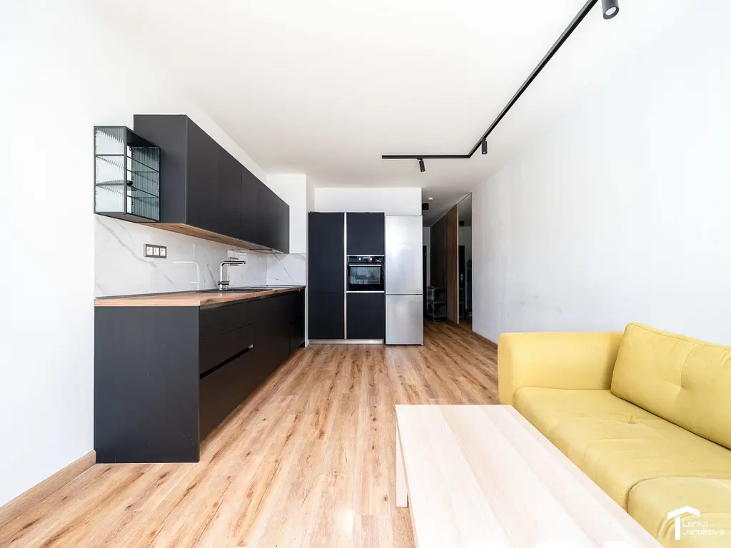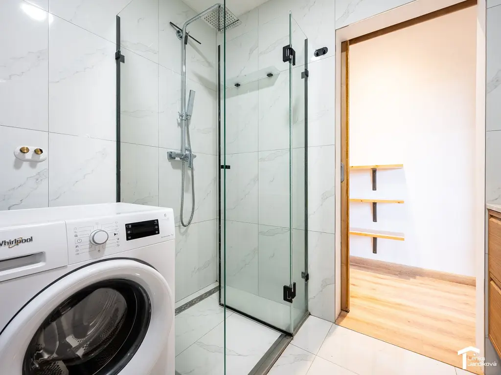 Po vstupu do bytu se ocitáme v chodbě, ze které vpravo je vstup na toaletu, na kterou navazuje samostatná komora s dostatečným úložným prostorem. Obývací pokoj je spojený se vstupem na terasu a dále s kuchyňským koutem, který má vestavěné spotřebiče (myčku, elektrickou troubu, indukční varnou desku, digestoř a volně stojící lednici s mrazákem). V obývacím pokoji lze ponechat k užívaní sedačku a konferenční stůl.