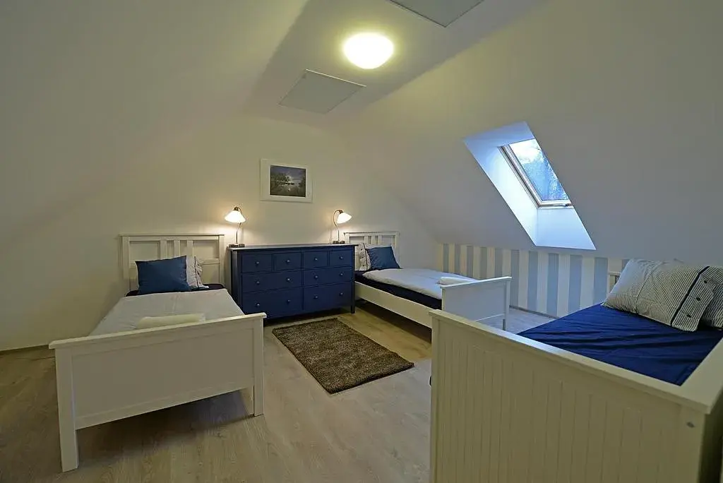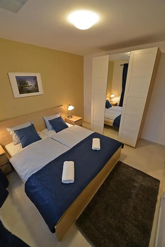 Dispozice přízemí: zádveří, chodba, ložnice, obývací pokoj s kuchyňským koutem. Obývací pokoj je propojený s podsklepenou terasou. V 2.NP se nachází druhá ložnice. Apartmán je kompletně vybavený včetně kuchyňské linky, sedačky, jídelního stolu, postelí, vestavěných skříní, televize, pračka - viz. fota. Apartmán je vybaven klimatizací.