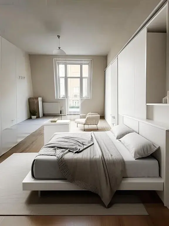 Byt je kompletně vybaven moderním nábytkem na míru, vyrobeným z materiálů nejvyšší kvality. Nabízí světlý obytný prostor, prostornou koupelnu s walk-in sprchou a množství úložných prostor. Celý interiér je navržen s důrazem na funkčnost a design.