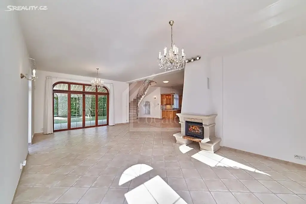 Moderní kuchyně je kompletně vybavena spotřebiči – sklokeramická varná deska, horkovzdušná trouba, myčka, lednice s mrazákem a digestoř. Otevřený obývací prostor navazuje na kuchyň a dominuje mu krb i přímý vstup na terasu a zahradu.