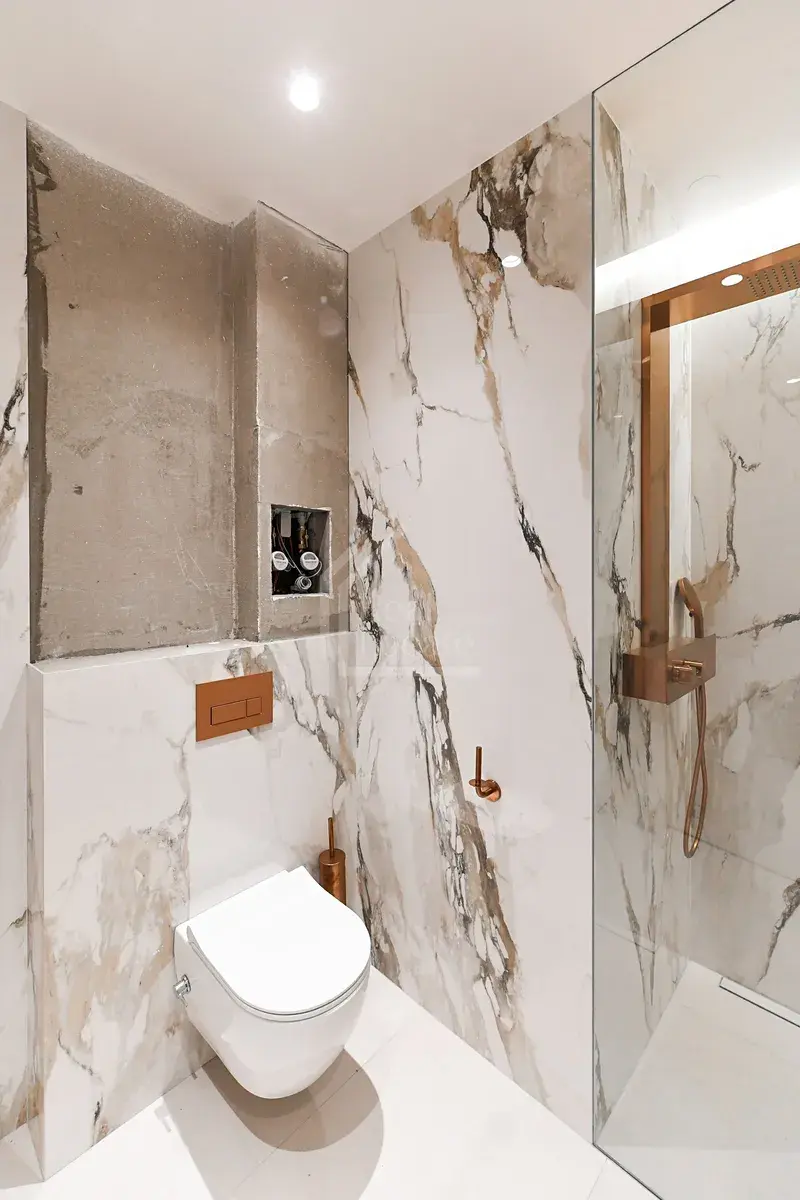 K bytu náleží dvě koupelny, z nichž jedna je vybavena vanou a druhá sprchovým koutem, samostatná toaleta a praktická technická místnost / komora vhodná pro pračku, sušičku a další úložné potřeby. Celkově dispozice klade důraz na komfortní bydlení s dostatkem úložných prostor.