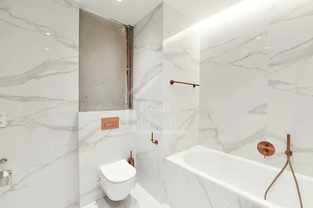 Byt dále nabízí koupelnu s vanou nebo sprchovým koutem, samostatnou toaletu a praktickou komoru / technickou místnost pro pračku, sušičku a další úložné řešení. Dispozice klade důraz na dostatek úložných prostor a pohodlný každodenní provoz. Celkové řešení bytu odpovídá moderním nárokům na komfortní městské bydlení s možností individuálního zařízení interiéru podle vlastních představ.