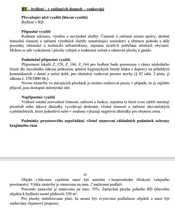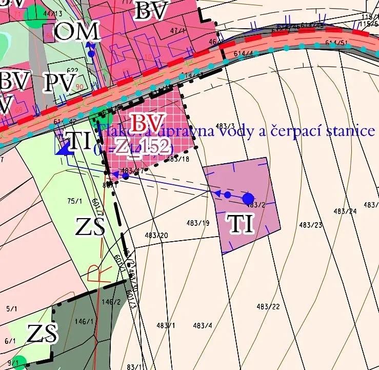 Část pozemku p.č 483/17 v rozsahu cca 440 m2 je v platném územním plánu obce označen jako BV – bydlení v rodinných domech venkovské, malá část cca 80 m2 jako ZS – plochy soukromé zeleně, zbylá část cca 345 m2 jako NZ - plocha zemědělská. Pozemek p.č. 614/6 je v platném územním plánu obce označen jako PV – veřejná prostranství – komunikační funkce.