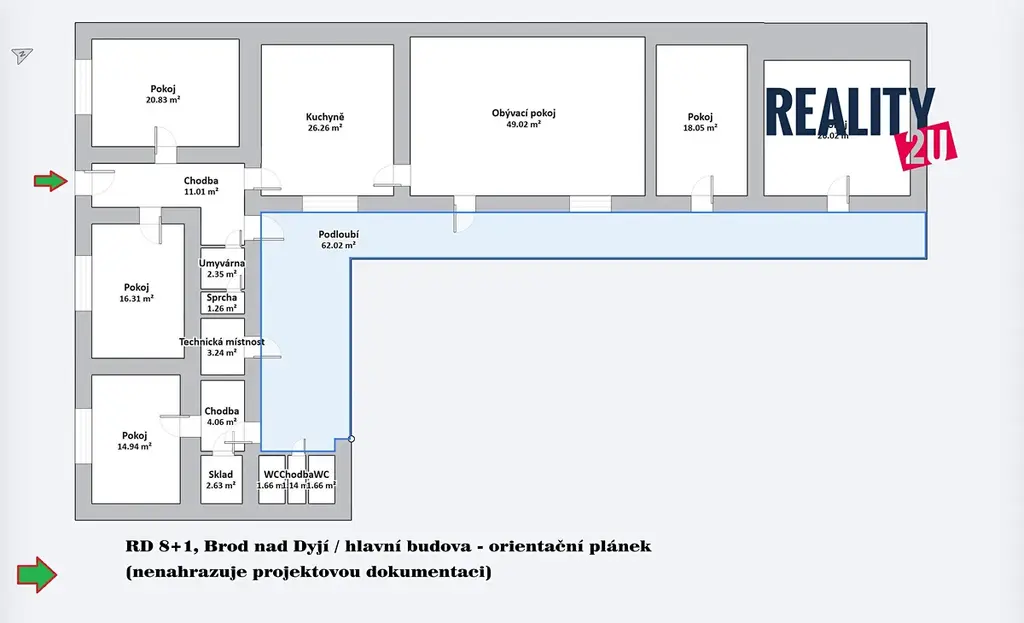 • Pokoje: jednotlivé místnosti mají rozměry od 15–26 m² (viz přiložený půdorys), poskytují dostatek prostoru pro ložnice, případně pokoje pro hosty