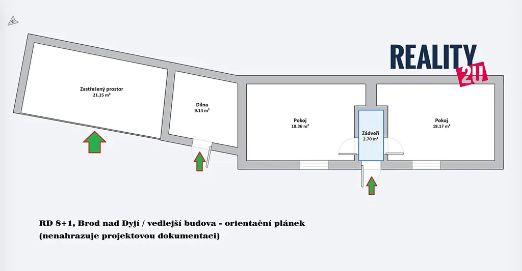 • Vedlejší stavba se pak skládá ze 2 samostatných pokojů, dílny, dřevníku a dalšího zastřešeného prostoru